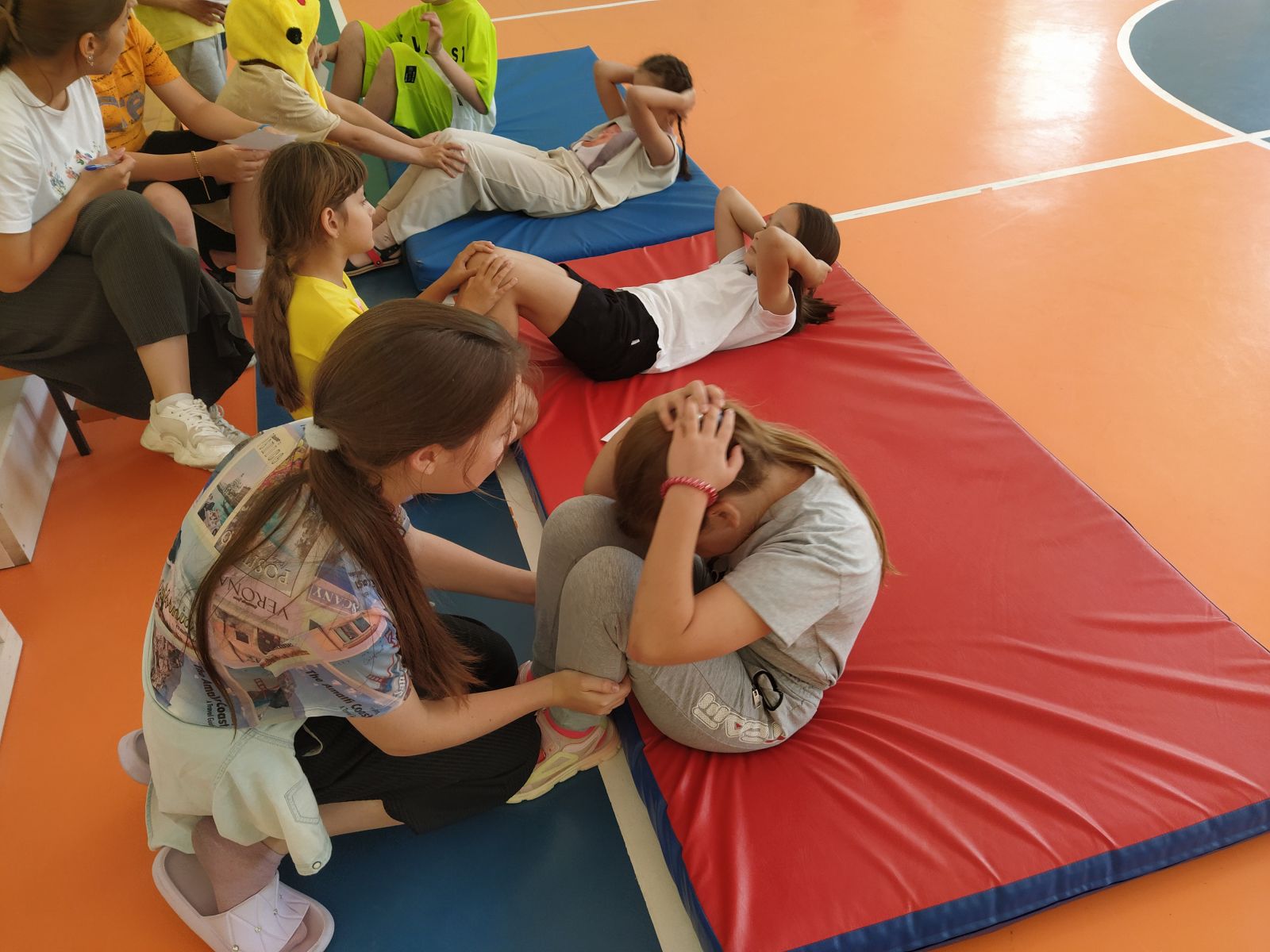 Воспитанники лагеря проходили такие испытание как: сгибание/разгибание рук в упоре лежа, прыжок в длину с места толчком двумя ногами, поднимание туловища из положения лежа, наклон вперёд (на гибкость). Судьи оценивали уровень подготовленности детей и следили за правильностью выполнения испытаний. Ребята активно принимали участие, проходили испытания с большим энтузиазмом и показали хорошие результаты.
