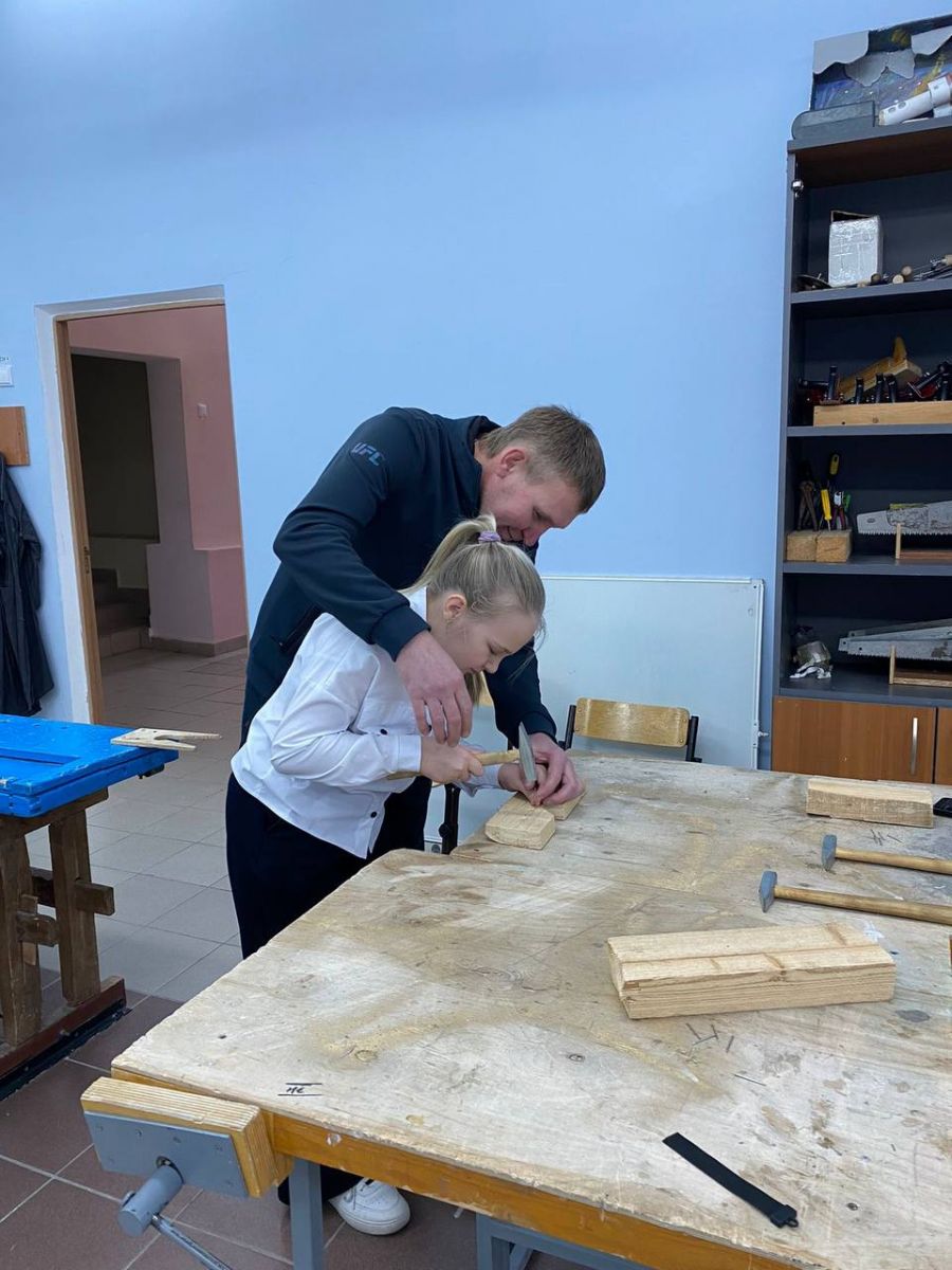 Участники квеста передвигались по различным станциям, на каждой из которых им предстояло выполнить задание на время. Папы разбирали автоматы, прибивали гвозди к доскам и даже пришивали пуговицы к ткани!