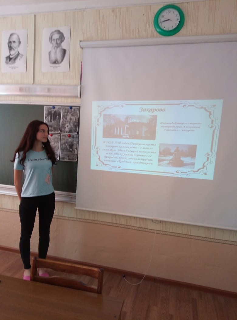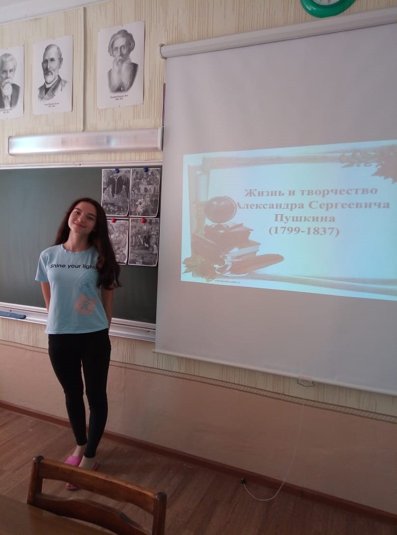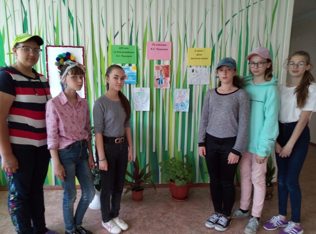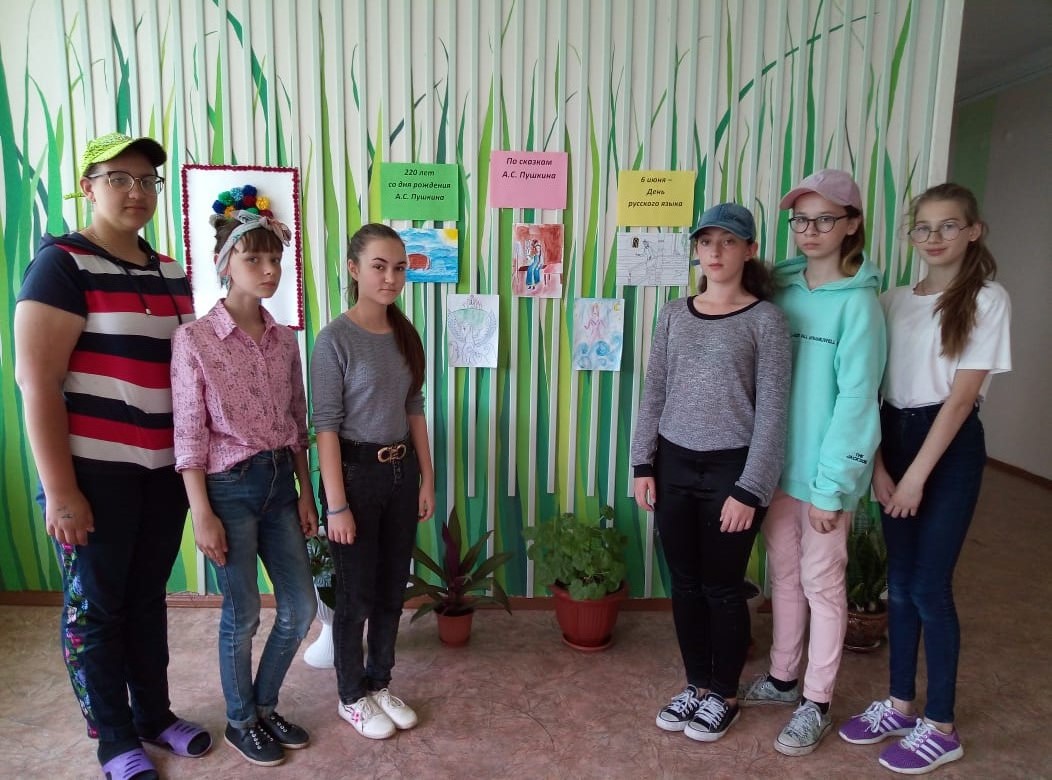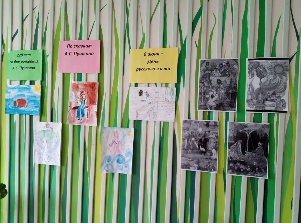 6 июня - День русского языка. Этот день приурочен ко дню рождения А. С. Пушкина. В этом году отмечается 220-летие со дня рождения великого русского поэта. Сегодня учащиеся 6-8 классов, члены трудовой бригады, приняли участие в мероприятии, посвящённом творчеству А. С. Пушкина. Мельникова Л. и Иксанова Э. (8 класс) подготовили познавательную и интересную презентацию и провели викторину по творчеству поэта. Девочки 6 и 7 классов провели организовали выставку рисунков по сказкам Пушкина.