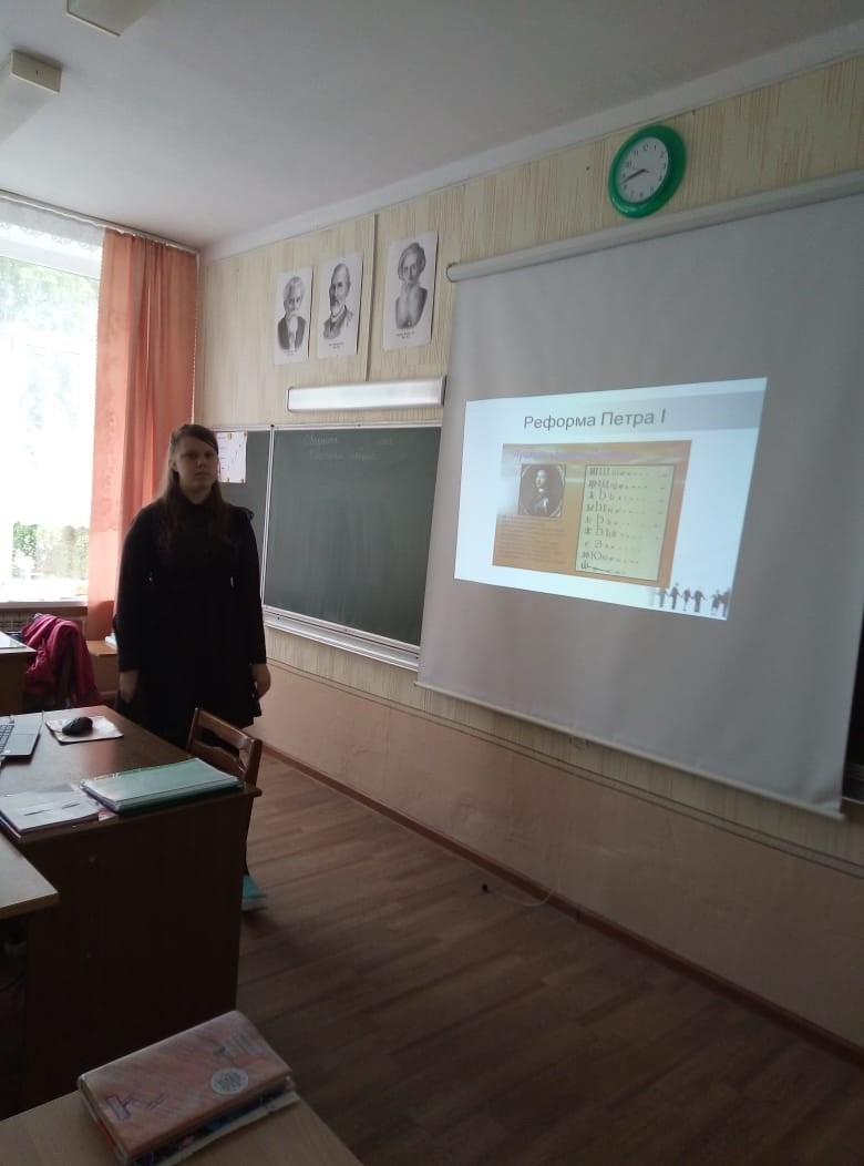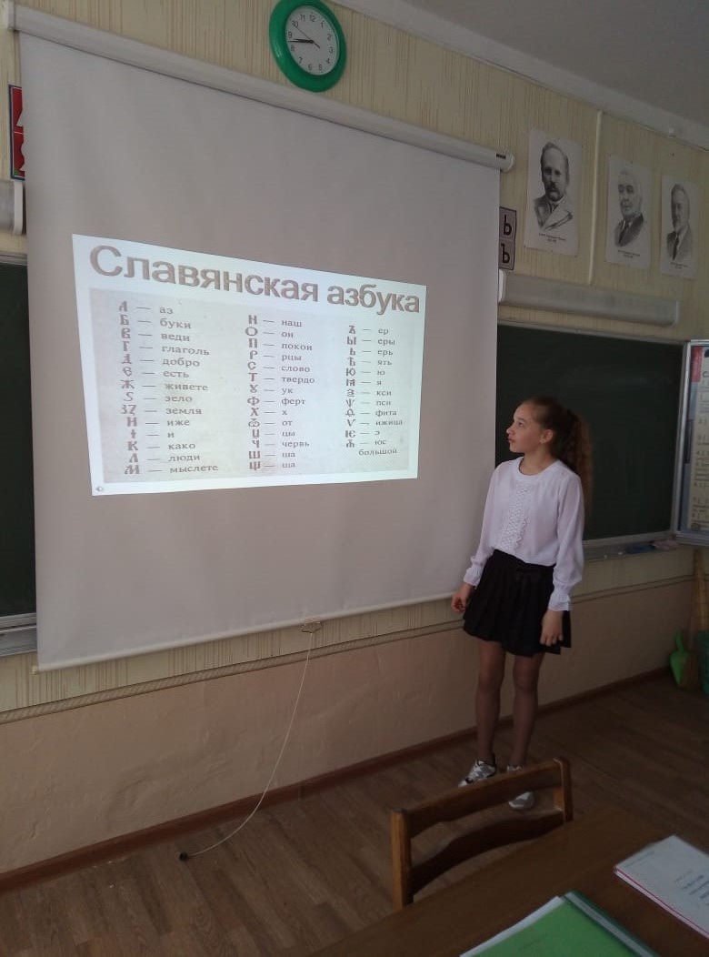 24 мая весь мир отмечает день славянской письменности. Сегодня на уроках русского языка ( учитель Маслакова Г. Я.) учащиеся познакомились с историей возникновения славянской азбуки, с именами её составителей, Кириллом и Мефодием. Кроме этого, учащиеся 5 и 8 класса презентовали проектные работы, посвящённые истории развития русского языка.