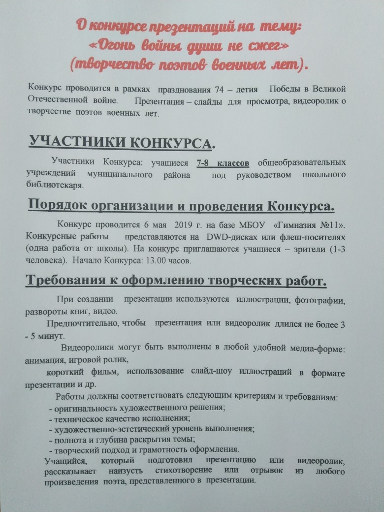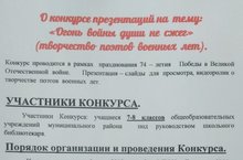 Конкурс проводится в рамках празднования 74 - летия Победы в Великой Отечественной войне. Презентация - слайды для просмотра, видеорролик о творчестве поэтов военных лет.