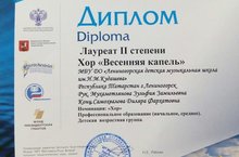 Хор "Весенняя капель" МБУ ДО ""Лениногорская детская музыкальная школа имени Н. М. Кудашева" Республики Татарстан г. Лениногорск стала лауреатом II степени в "АРТ Фестивале - Роза Ветров". Ученица 4 класса Лопатова Карина участница конкурса.