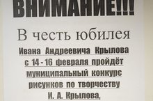 ВНИМАНИЕ!!!В честь юбилеяИвана Андреевича Крыловас 14 - 16 февраля пройдёт муниципальный конкурс рисунков по творчествуИ. А. Крыловасреди учащихся 5 и 6 классов.Лучшие работы будут отправлены на конкурс между школами города и района!!!Требования:формат рисунка А 3;на обороте рисунка подписать школу, Ф. И. О., класс;рисунки принимаю до 13 февраля включительно;рисунки сдаём библиотекарю Андреевой Л. М.