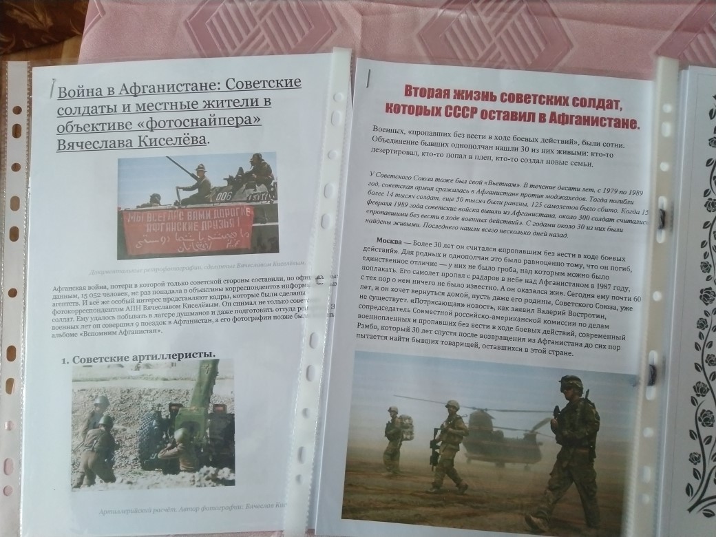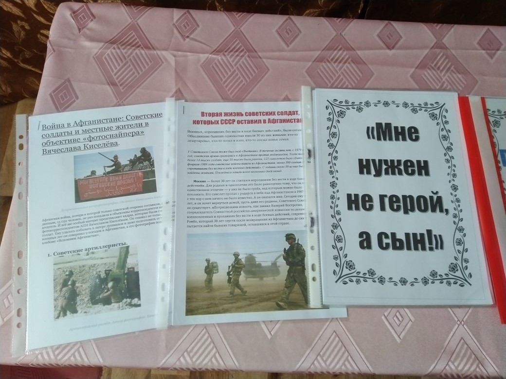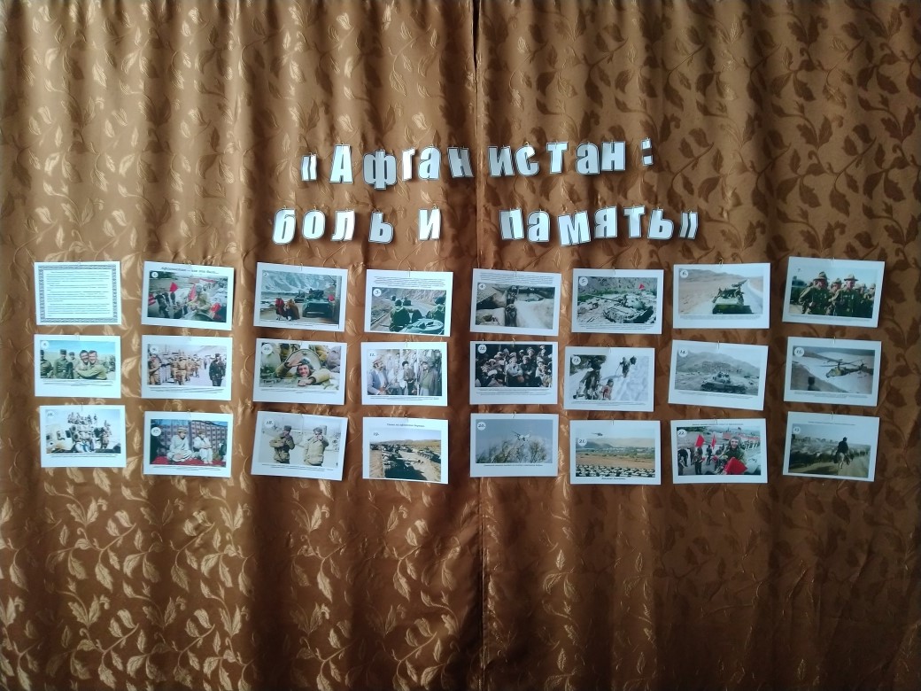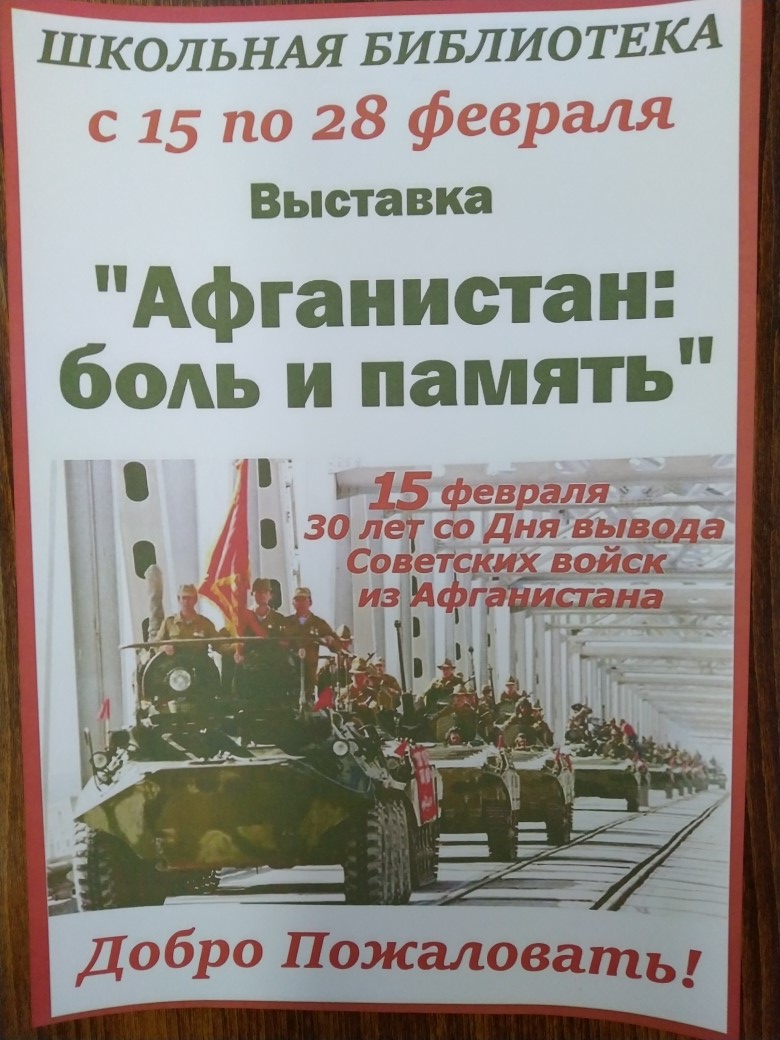 15 февраля 2019 г. в нашей школе состоялась беседа «Афганистан – наша память и боль», посвященная 30 годовщине вывода советских войск из ДР Афганистан. Мероприятие началось с презентации фотовыставки «Афганистан: боль и память», в которой представлены наиболее впечатляющие фотографии о повседневной жизни и службе военнослужащих Ограниченного контингента советских войск в Афганистане (1979-1989 годы). Фотовыставка призвана сохранить память об истории и войне, которой оказались связаны две страны.Беседа была наполнена проникновенным стихами, музыкальными номерами. В течение мероприятия демонстрировались фото-документы из личных архивов ветеранов «афганской» войны, кадры кинохроники, посвящённые этим героическим и трагическим событиям.Рассказывали о том, как приходилось выживать в военно-полевых условиях на чужой территории, как старались помогать товарищам и мирному афганскому народу. Ведь далеко не каждый день приходилось воевать, в большинстве случаев оказывали народу Афганистана помощь: занимались строительством, обеспечивали население лекарствами и продуктами питания.Большинство школьников имеют весьма смутное представление о войне в Афганистане, многие вообще узнают о ней впервые. Слушают с интересом, задают много вопросов. Говорили с детьми не только о войне, затрагивали самые различные темы, которые интересуют подростков. Слушая рассказы о подвигах, дети начинают осознавать, как важно выполнять свой долг перед Родиной, защищая ее.Также приготовлены памятный альбом погибших героев, статья "Мне нужен не герой, а сын!" (трогательное интервью матери погибшего героя в Афганистане), уникальные ретро фотографии и многое другое.Педагог-организатор Андреева Л. М. -