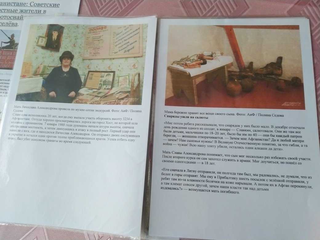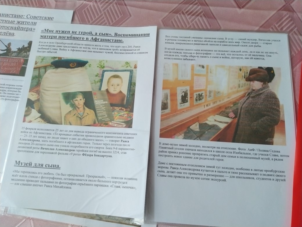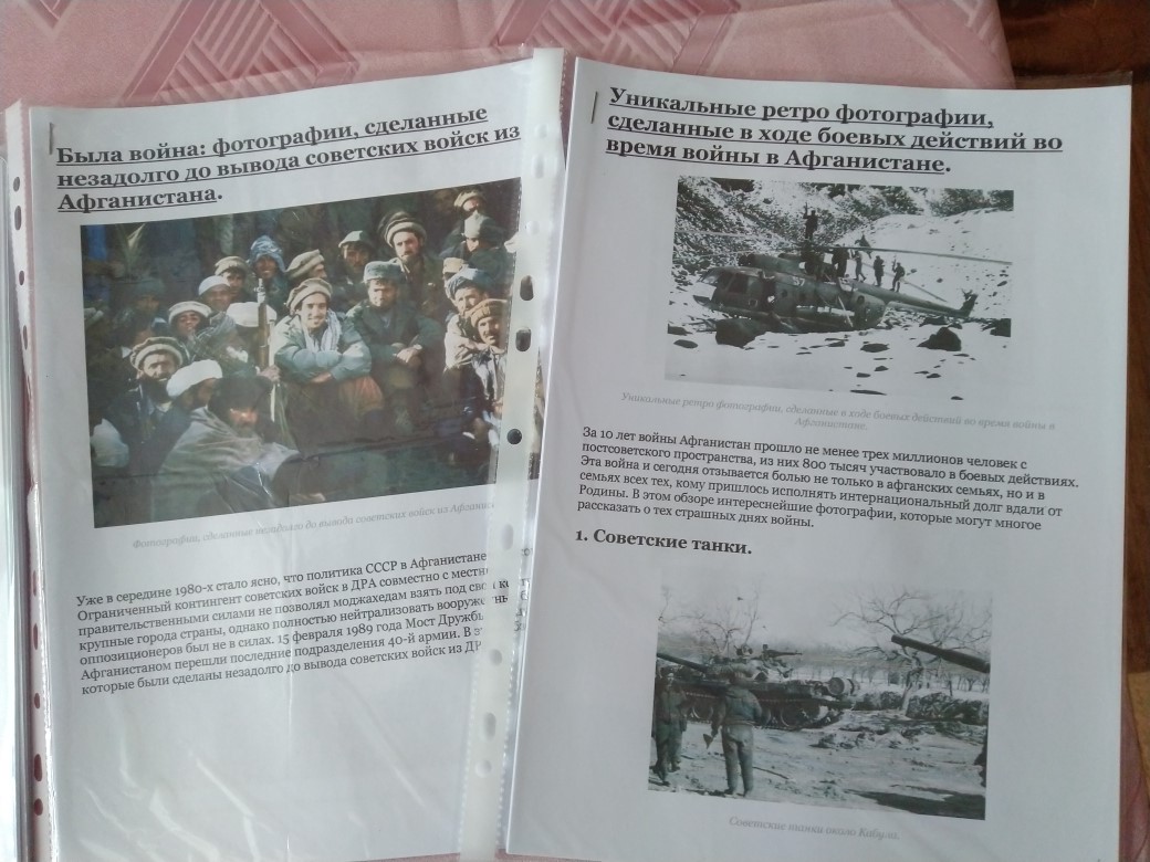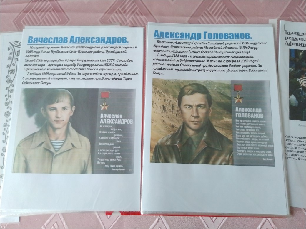 15 февраля 2019 г. в нашей школе состоялась беседа «Афганистан – наша память и боль», посвященная 30 годовщине вывода советских войск из ДР Афганистан. Мероприятие началось с презентации фотовыставки «Афганистан: боль и память», в которой представлены наиболее впечатляющие фотографии о повседневной жизни и службе военнослужащих Ограниченного контингента советских войск в Афганистане (1979-1989 годы). Фотовыставка призвана сохранить память об истории и войне, которой оказались связаны две страны.Беседа была наполнена проникновенным стихами, музыкальными номерами. В течение мероприятия демонстрировались фото-документы из личных архивов ветеранов «афганской» войны, кадры кинохроники, посвящённые этим героическим и трагическим событиям.Рассказывали о том, как приходилось выживать в военно-полевых условиях на чужой территории, как старались помогать товарищам и мирному афганскому народу. Ведь далеко не каждый день приходилось воевать, в большинстве случаев оказывали народу Афганистана помощь: занимались строительством, обеспечивали население лекарствами и продуктами питания.Большинство школьников имеют весьма смутное представление о войне в Афганистане, многие вообще узнают о ней впервые. Слушают с интересом, задают много вопросов. Говорили с детьми не только о войне, затрагивали самые различные темы, которые интересуют подростков. Слушая рассказы о подвигах, дети начинают осознавать, как важно выполнять свой долг перед Родиной, защищая ее.Также приготовлены памятный альбом погибших героев, статья "Мне нужен не герой, а сын!" (трогательное интервью матери погибшего героя в Афганистане), уникальные ретро фотографии и многое другое.Педагог-организатор Андреева Л. М. -