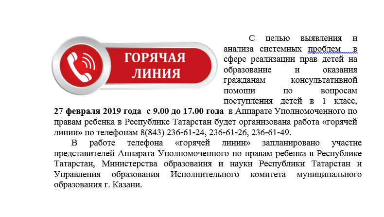 С целью выявления и анализа системных проблем в сфере реализации прав детей на образование и оказания гражданам консультативной помощи по вопросам поступления детей в 1 класс, 27 февраля 2019 года с 9.00 до 17.00 года в Аппарате Уполномоченного по правам ребенка в Республике Татарстан будет организована работа «горячей линии» по телефонам 8(843) 236-61-24, 236-61-26, 236-61-49.