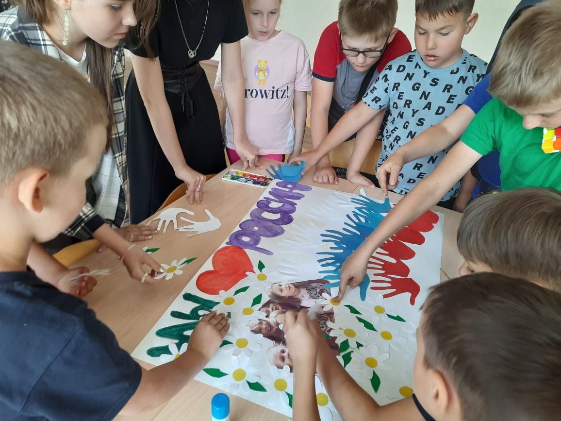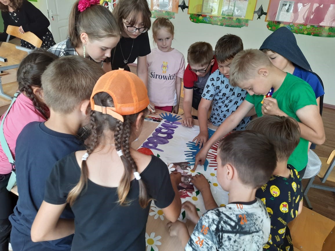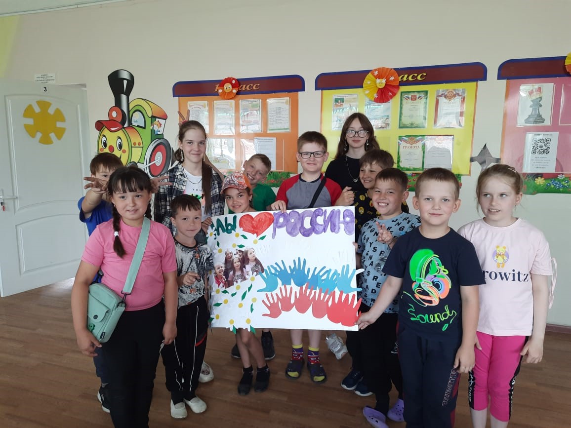 9 день наступил. Сегодня он пройдет под девизом «Мы любим свою Родину!», так как скоро праздник 12 июня –День независимости России.Сегодня на линейке Лилия Юрьевна нам рассказала о правильном питании. Мы узнали , что такое сбалансированное питание, режим питания, пищевая пирамида.После танцевальной зарядки дежурные побежали накрывать завтрак, а мы стали думать над проектом плаката к празднику.Позавтракав, мы побежали на спортивную площадку, так как позже обещали дождь, отложив выполнение плаката на позднее время.Наигравшись, побежали в наш «Солнечный» штаб, где нас уже ждали ватман, цветная бумага , краски, ножницы, клей и шаблоны для вырезания деталей.Никто не сидел без дела: кто обводил шаблоны, кто вырезал, кто раскрашивал, кто клеил. Получилась замечательная газета с российским триколором, белоснежными ромашками и детскими улыбками!Всех с наступающим праздником! Мирного неба и процветания всей нашей стране!А мы домой, так как день сегодня предпраздничный, короткий.До свидания, лагерь, до скорых встреч! -