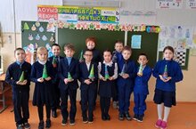 В завершении недели начальных классов учащиеся 1 класса отправились в виртуальное путешествие «Новый год в стране Математики». Целью внеклассного мероприятия было знакомство с новогодними традициями разных стран. В каждой стране ребят ожидали индивидуальные и парные задания: найти пару математическому сапожку в Англии, восстановить арифметическую цепочку в Италии, прочить загадочное письмо японского мальчика, расшифровать название животного, которое считается символ благополучия в Германии, кивнуть или опровергнуть высказывание по-болгарски. Вернувшись в Россию, первоклассникам необходимо было украсить ёлочку золотыми или синими дождинками в зависимости от своего настроения и практического применения полученных знаний. Главным символом новогоднего путешествия стала ёлочка в золотом дожде. -