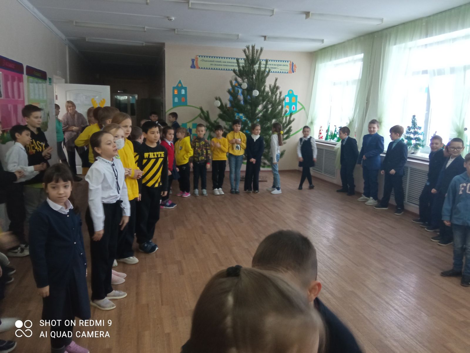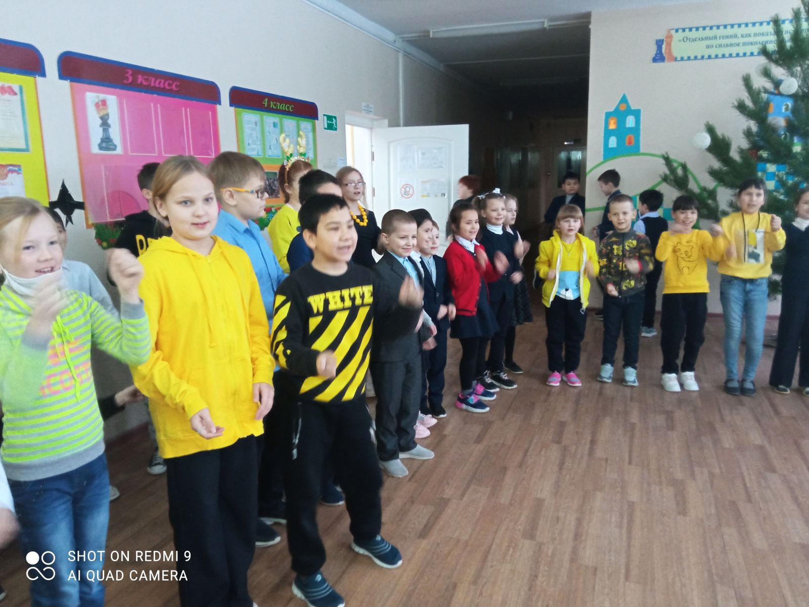 22 декабря продолжилась цветная неделя в преддверии Новогодних праздников.8 класс взял бразды правления в четверг-желтый день. Накануне вечером по всей школе были расклеены желтые зайчики, символ 2023 года.А в четверг все перемены проводились танцевальные игры и конкурсы в рекреации начальных классов. -