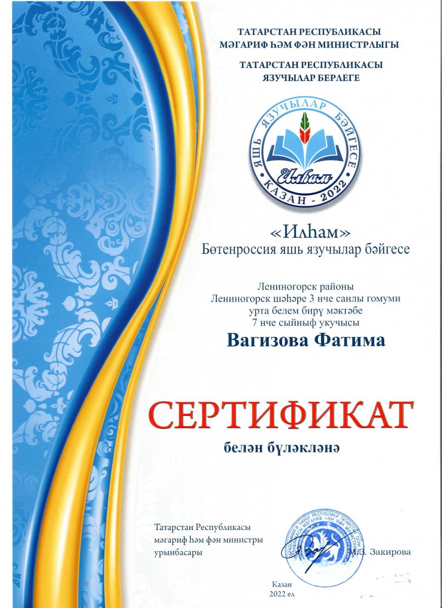 В рамках реализации государственной программы «Сохранение, изучение и развитие государственных языков Республики Татарстан и других языков в Республике Татарстан на 2014-2022 годы», Министерство образования и науки Республики Татарстан и общественная организация «Союз писателей Республики Татарстан» в целях выявления и развития одаренных детей и молодежи, создания возможностей для самореализации молодых талантов, воспитания любви и уважения к родному языку, культуре своего народа проводит всероссийский конкурс юных поэтов и писателей «Илһам» («Вдохновение»)». Ученица 7 класса Вагизова Ф. (учитель Мухутдинова Р.Ф.) приняла участие в номинации «Юный поэт». -