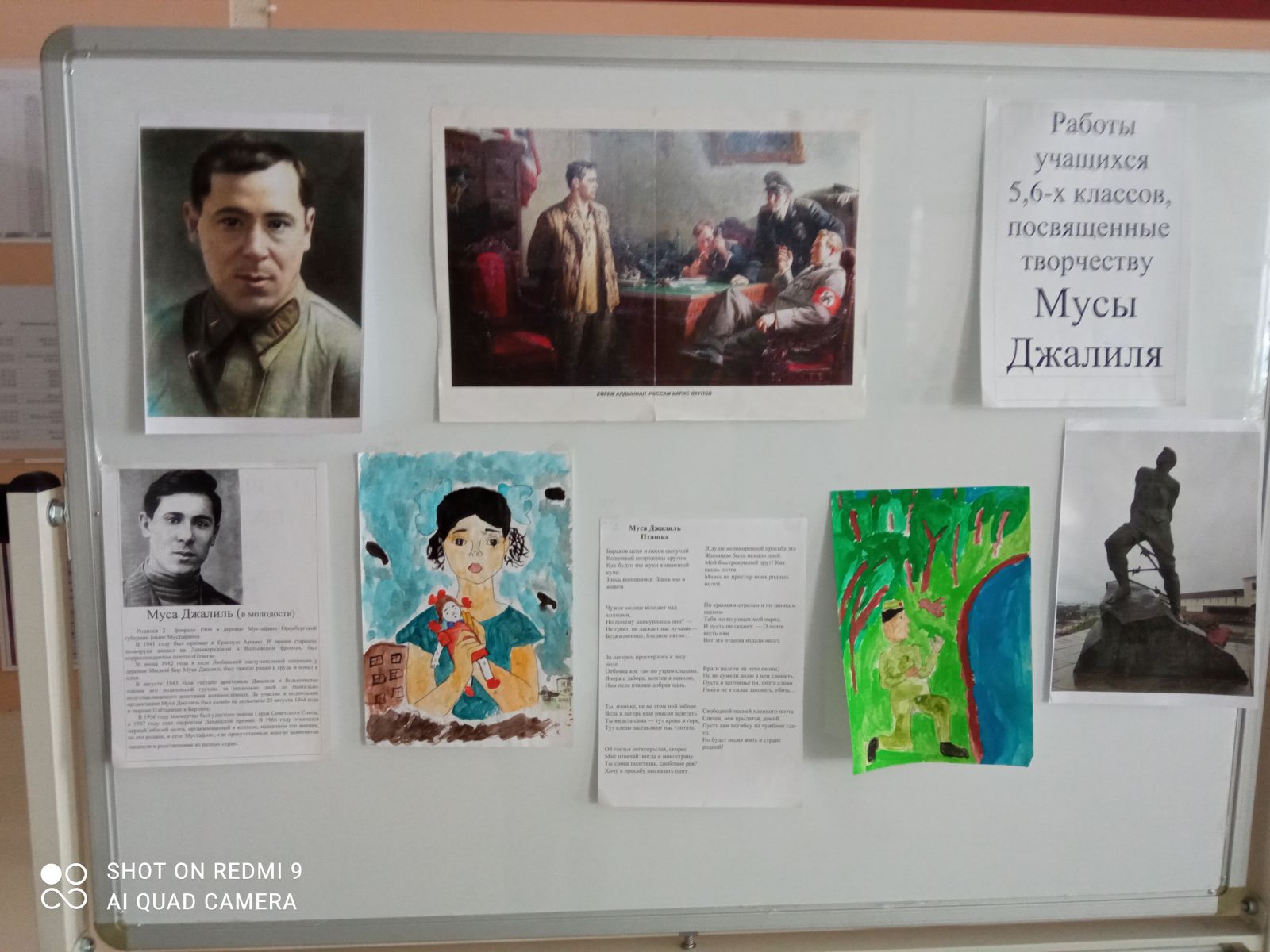 В день рождения великого татарского поэта в 6 и 8 классах (учитель Журавлева М.П.) прошел урок литературы по теме “Муса Джалиль – поэт-герой”. Ребята ознакомились с жизнью известного татарского поэта Мусы Джалиля, узнали о его детстве, школьных годах и боевой комсомольской юности, прочитали и послушали стихи, которые он написал, находясь в застенках фашистского концлагеря. Кадры военной кинохроники с документального фильма дополняли устную информацию учителя и учащихся.Джалиль писал, что надо "жить, так, чтобы и после смерти не умирать". Жить не ради жизненного соблазна, славы или богатства, а ради правды и свободы, ради справедливости. И даже если наступает буря, если тьма окружила все вокруг, надо не падать духом и бороться. Джалиль, говоря об этом, своей жизнью и смертью еще раз подчеркнул свой призыв: "Свети потомкам нашим, как маяк, свети, как человек, а не светляк". -