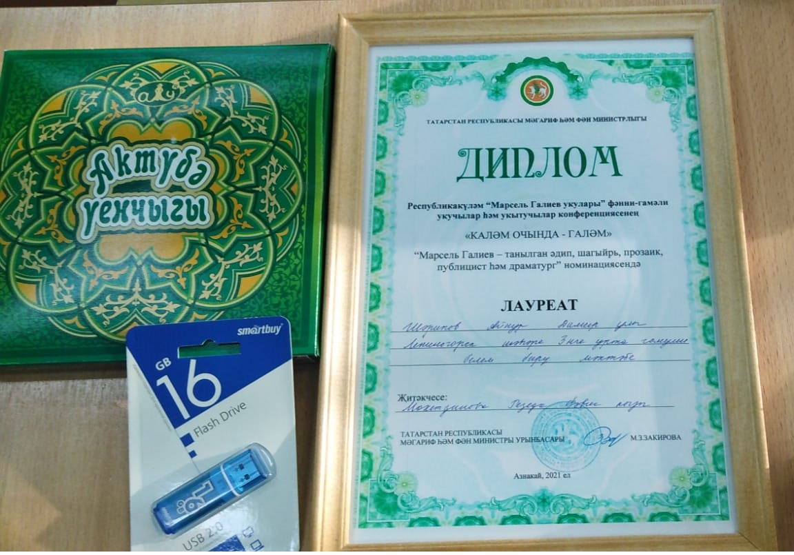 С целью выявления одарённых детей и создания условий, стимулирующих развитие интеллектуального развития обучающихся посредством вовлечения их в исследовательскую деятельность, ознакомления обучающихся с творческим наследием писателя, привлечения учителей к обмену опытом, 20 декабря 2021 года была проведена республиканская научно – практическая конференция школьников и учителей «Чтения Марселя Галиева». Учитель родного (татарского) языка и литературы Мухутдинова Р.Ф. поделилась опытом по теме «Реализация принципа межпредметного взаимодействия на уроках литературы», ученик 7 класса Шарипов А. защитил проектную работу и стал лауреатом. -