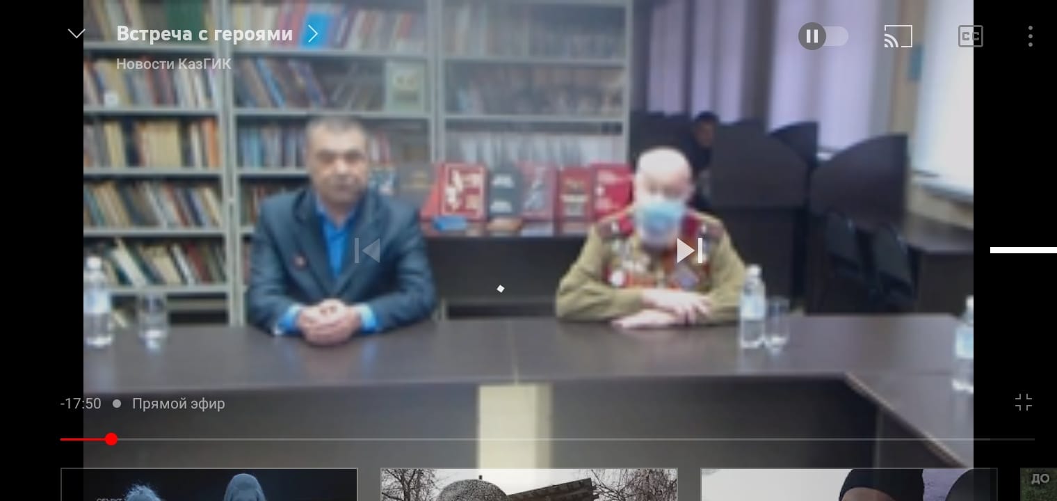 9 декабря в нашей стране отмечается День Героев Отечества, в этот день мы чествуем героев, защищавших Родину в трудный час испытаний.С целью совершенствования работы в области патриотического воспитания молодежи, привлечению школьников к изучению ратных страниц в истории Отечества Республиканский центр спортивно-патриотической и допризывной подготовки молодежи «Патриот» совместно с Казанским государственным институтом культуры 9 декабря проводил онлайн встречу с людьми, проявившими доблесть и отвагу на полях сражений:- участником Великой отечественной войны, Ботовым Борисом Алексеевичем, награжденным орденом Великой Отечественной войны 1 степени и орденом Красной Звезды;- участником боевых действий в Афганистане, Вафиным Рустемом Габдулхаковичем, награжденным орденом Красной Звезды. -