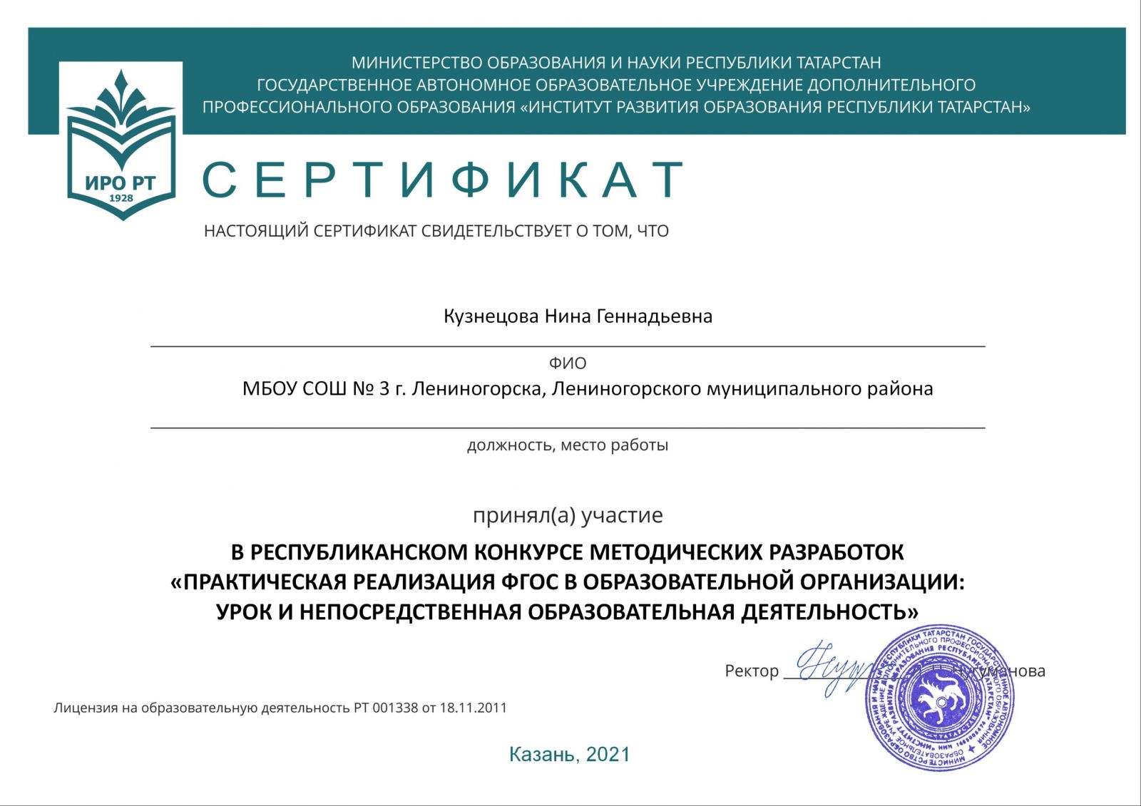 Учитель истории и обществознания Н.Г. Кузнецова приняла участие в Республиканском конкурсе методических разработок «Практическая реализация ФГОС в образовательной организации: урок и непосредственная образовательная деятельность», организованном Государственным автономным образовательным учреждением дополнительного профессионального образования «Институт развития образования Республики Татарстан» (приказ ГАОУ ДПО ИРО РТ от 08.10.2021 г. № 507).Основная цель Конкурса – повышение профессионального мастерства педагогических работников, выявление, обобщение и распространение инновационного опыта работы педагогических работников и совершенствование научно – методического обеспечения образовательного процесса. -