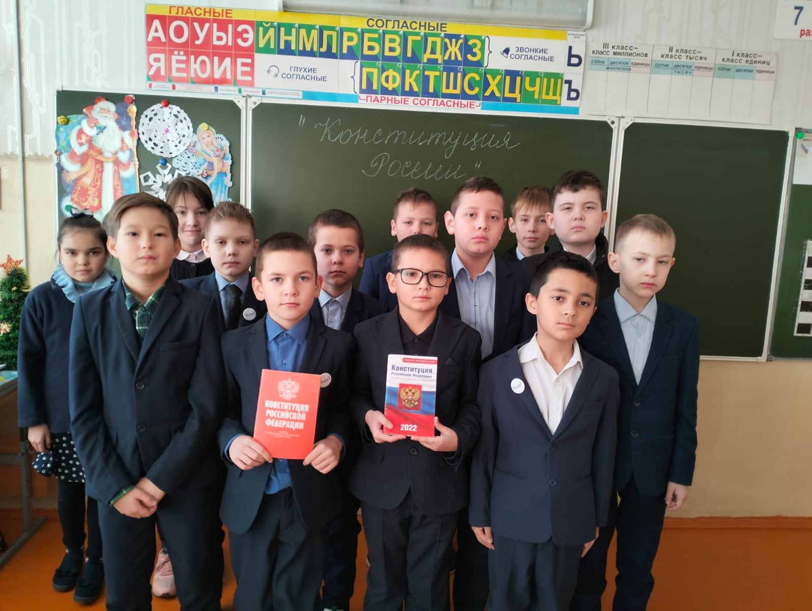 12 декабря в 3 классе прошёл классный час на тему «День Конституции Российской Федерации". В ходе которого, ребята узнали, что каждое государство предоставляет своим гражданам права, которые прописаны в Конституции — основном законе страны, вспомнили государственные символы России, прочитали основные права человека: на жизнь, на свободу, на образование, на выбор профессии, на отдых, жильё, медицинскую помощь. -