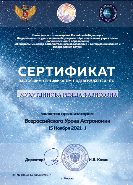 В 4 и 8 классе кл.руководителем Журавлевой М.П. был проведен Всероссийский урок астрономии, который позволил привлечь внимание учащихся к предмету и теме изучения одной из старейших в мире наук – астрономии.Темы уроков: «Космический зоопарк, или Животные в космосе» (для обучающихся 1 - 4 классов); «Планеты Солнечной системы» (для обучающихся 5 - 8 классов). В ходе урока учащиеся смотрели видеоролики, презентации и выполняли задания, используя методические материалы по организации и проведению урока Министерства просвещения Российской Федерации и Федерального государственного бюджетного образовательного учреждения дополнительного образования «Федеральный центр дополнительного образования и организации отдыха и оздоровления детей» -