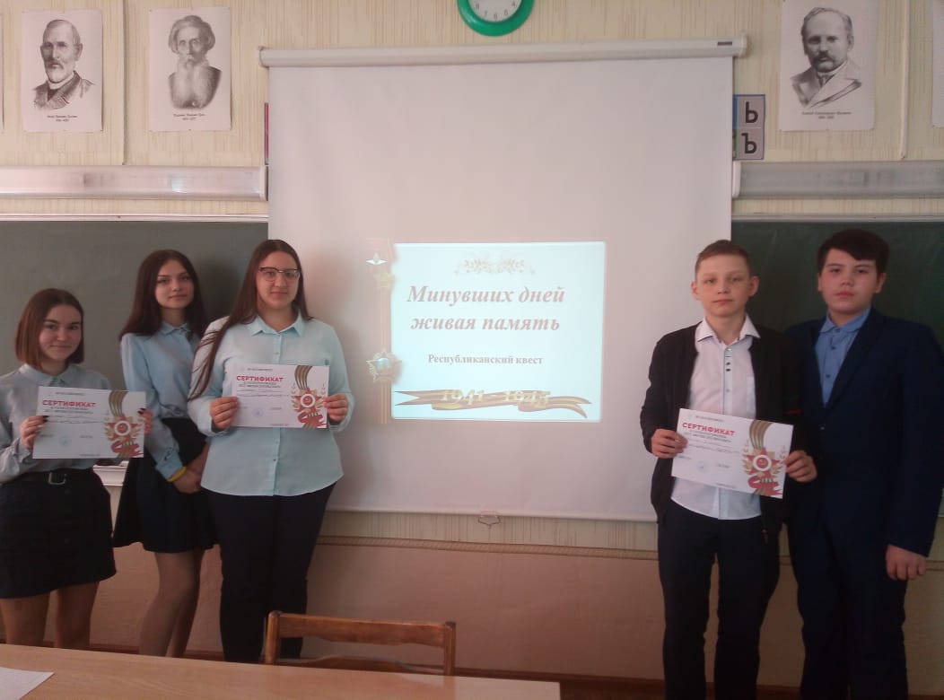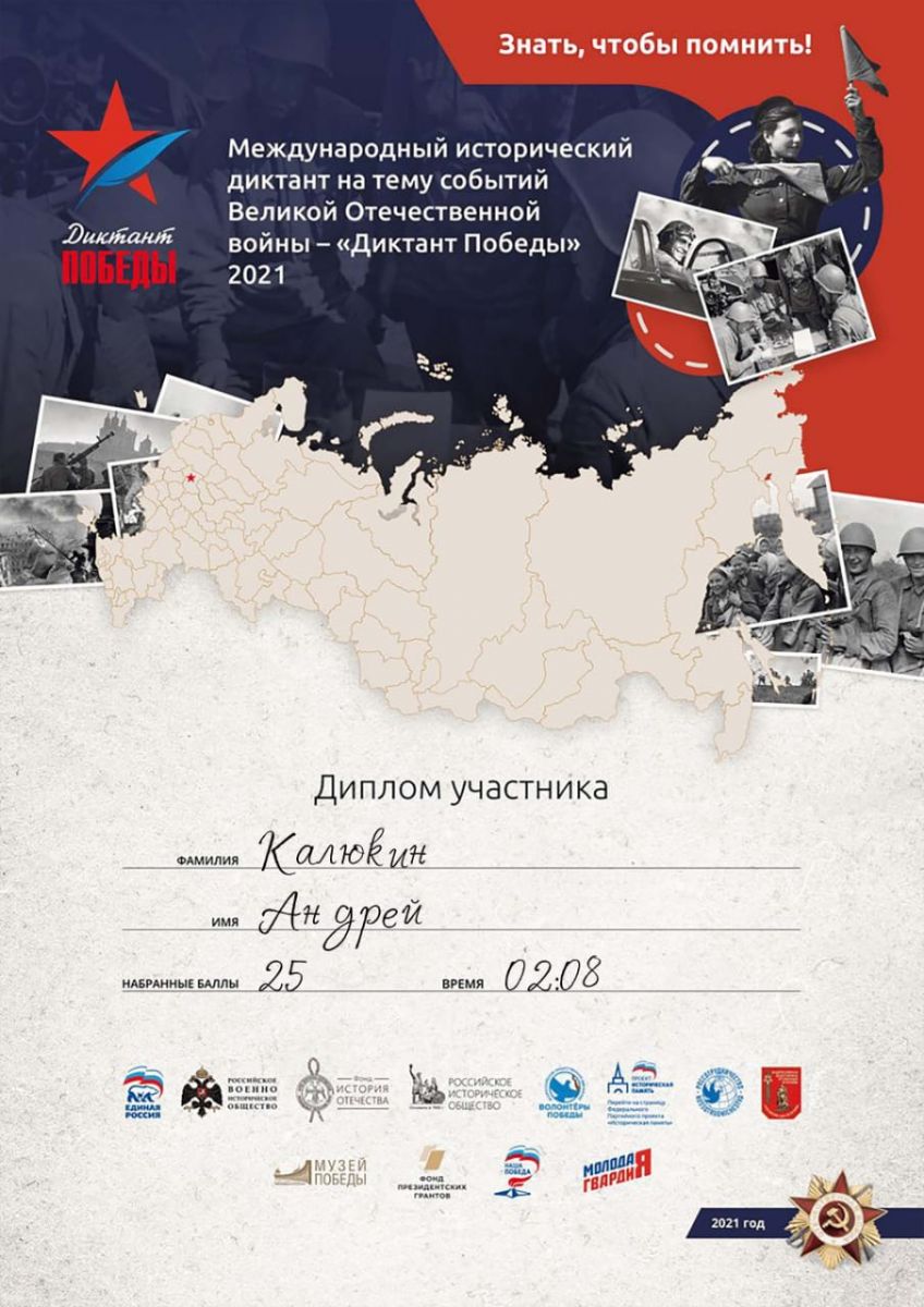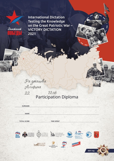 29 апреля состоялась Международная акция, посвященная Великой Отечественной Войне Диктант Победы. Учащиеся нашей школы Калюкин А. и Раджапова А. успешно ответили на вопросы теста и получили дипломы участников. -