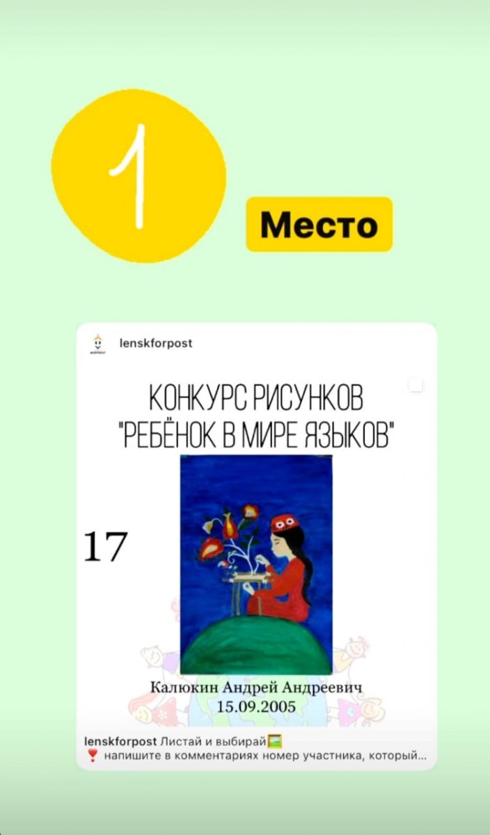 Ученик 9 класса Калюкин А. принял участие в муниципальном конкурсе рисунков на тему "Ребенок в мире языков" и занял 1 место ПОЗДРАВЛЯЕМ!!!