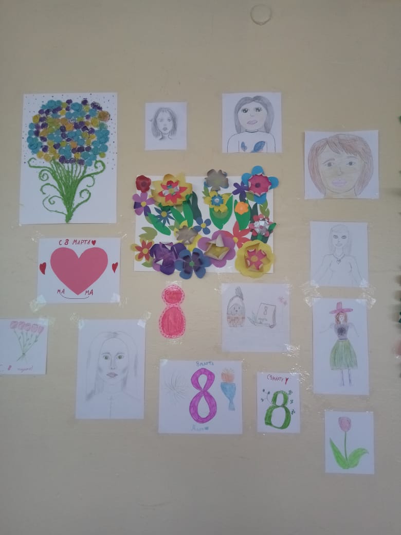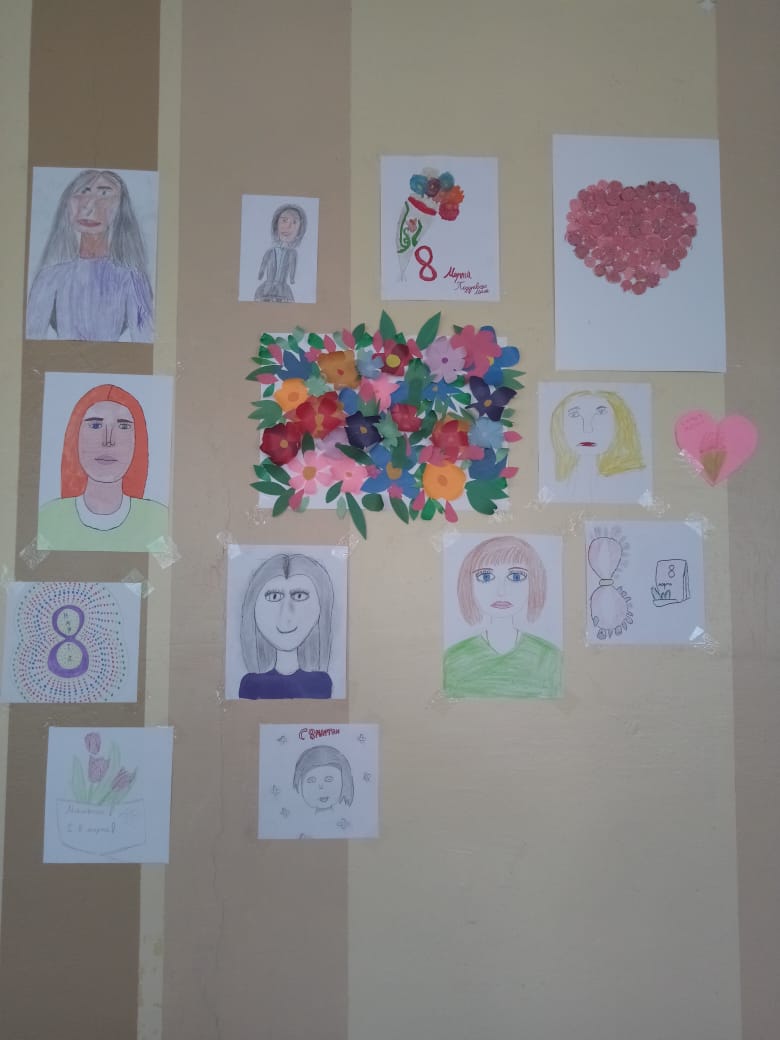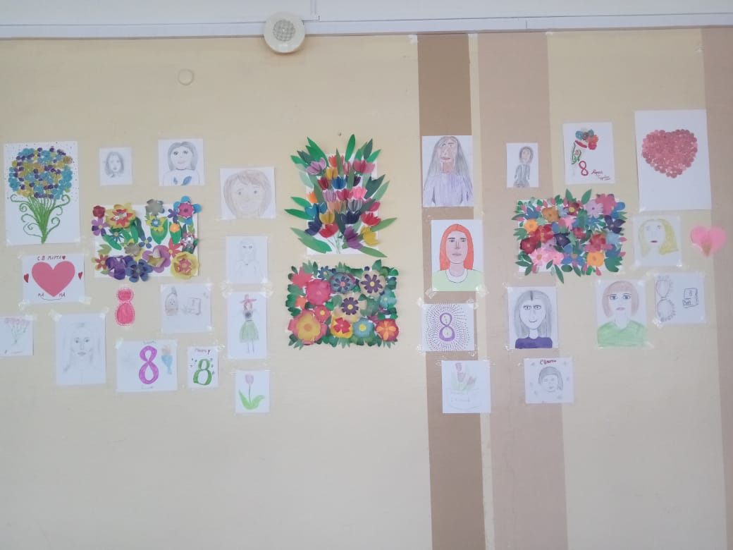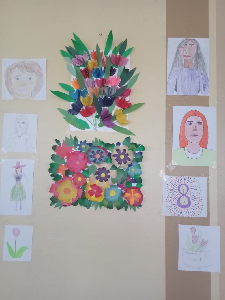 Под руководством учителя технологии Зариповой А. Г. учащимися 5-6-7 классов был выполнен проект посвящённый Дню восьмого марта. Ученики выразили свои поздравления в виде портретов мамы, поздравительных открыток и панно. -