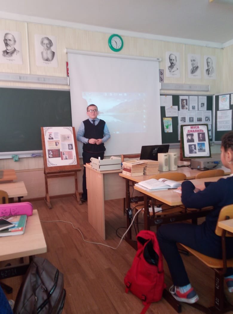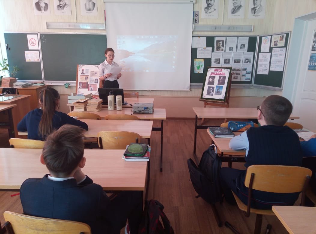 В 6 и 7 классе прошли уроки литературы (учитель Маслакова Г. Я.), посвящённые 115-летию со дня рождения великого татарского поэта Мусы Джалиля. Учащиеся вспомнили основные факты биографии поэта, читали наизусть наиболее понравившиеся им стихотворения Мусы Джалиля. -