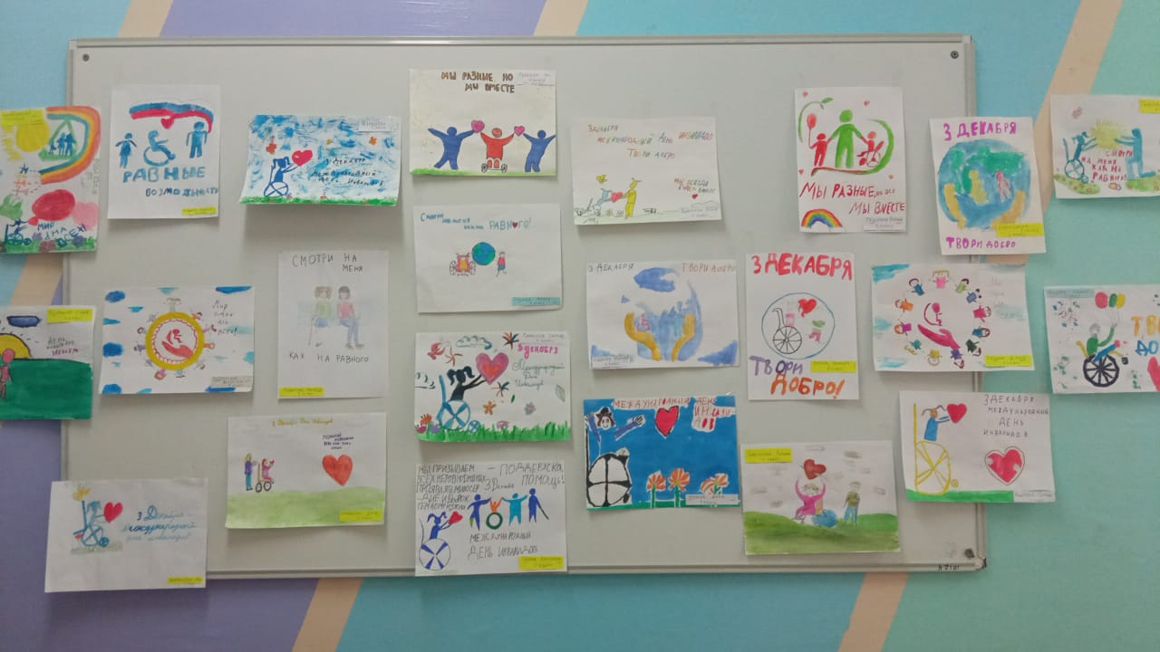Учащиеся 4 и 5 класса приняли участие в благотворительной акции, посвященной Дню инвалидов. Они организовали выставку рисунков на тему "Твори добро". -