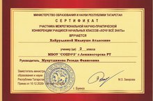 Ученица 2 класса Хайруллина М. принимала участие в Межрегиональной научно - практической конференции учащихся начальных классов «Хочу всё знать». Она выполнила исследовательскую работу по окружающему миру «Сохраним леса – дадим бумаге вторую жизнь!» -