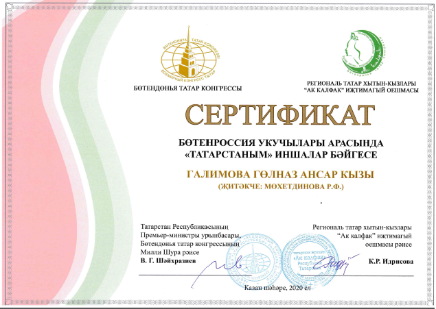 Ученица 5 класса Галимова Г., прошла во второй этап и стала участницей Всероссийского конкурса сочинений «Мой Татарстан», организованным Всемирным конгрессом татар. -