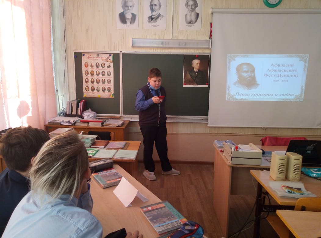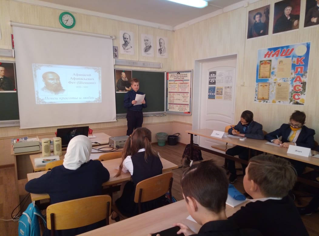 8 декабря в 6 классе прошёл необычный урок литературы (учитель Маслакова Г. Я.) на тему "Певец любви и красоты". Конкурс чтецов был посвящён 200-летию со дня рождения великого русского поэта А. А. Фета. Ребята подготовили сообщение о жизни и творчестве поэта, читали его стихи. По итогам конкурса жюри подвело итоги и определило призёров и победителей. Все участники мероприятия получили небольшие призы. -