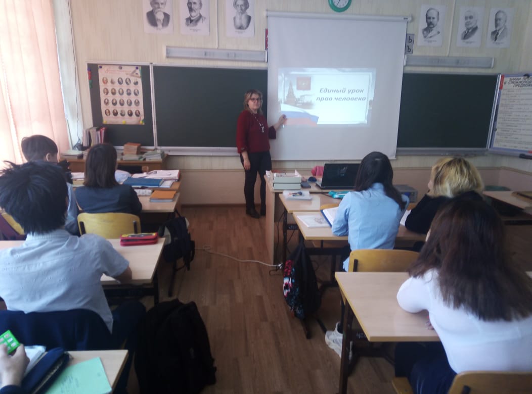 11 декабря в 9 классе (классный руководитель Маслакова Г.Я.) и во 2 классе (классный руководитель Мухутдинова Р.Ф.) прошел Всероссийский единый урок «Права человека». В ходе мероприятия учащиеся познакомились с историей подписания международных документов: Всемирной Декларации по правам человека, Конвенции о правах ребенка. Ребята обсудили права и обязанности гражданина, рассмотрели основные статьи Конституции РФ. -