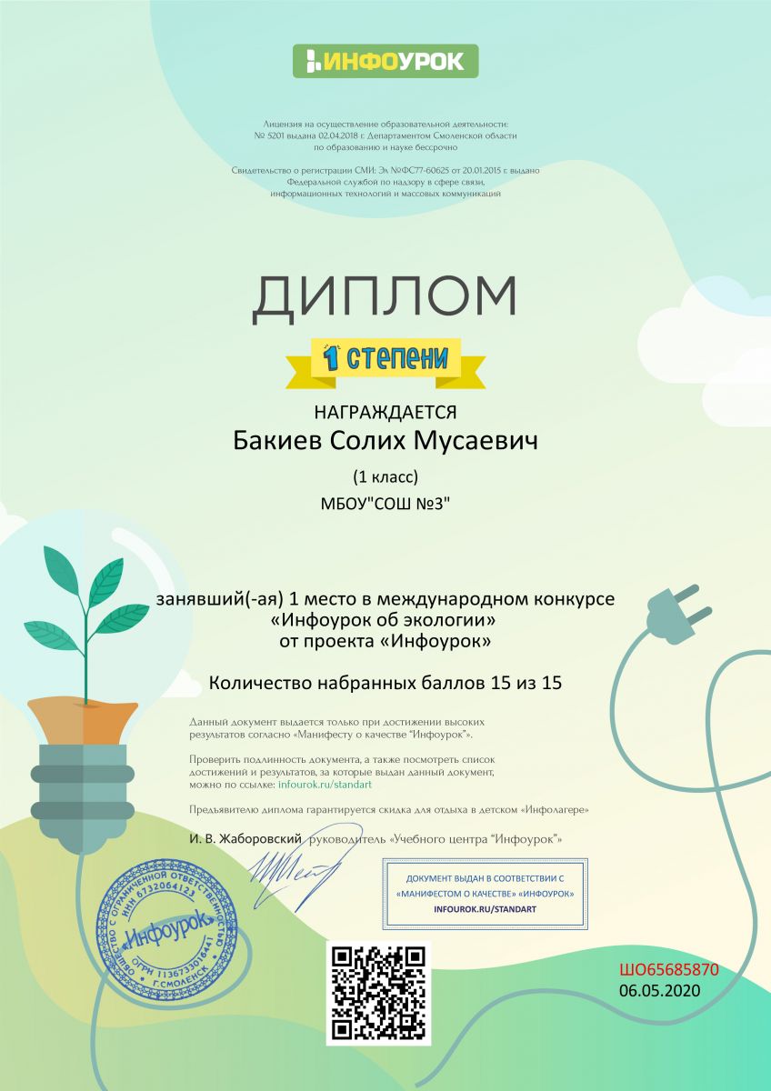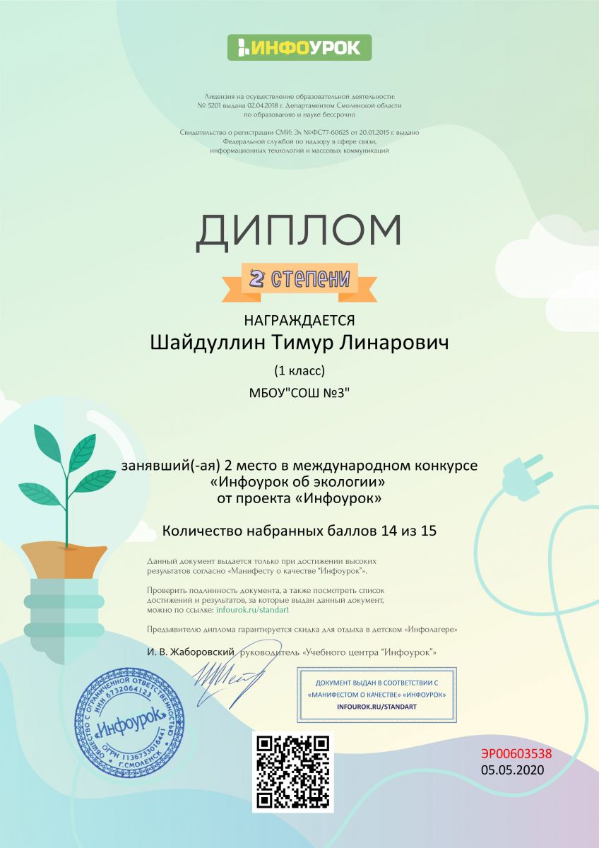 Учащиеся 1 класса Шайдуллин Тимур и Бакиев Солих (классный руководитель Мухутдинова Р. Ф.) приняли участие в международном конкурсе "Инфоурок об экологии" и заняли призовые места. Поздравляем!