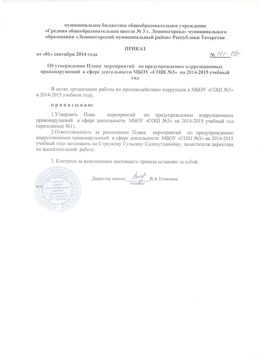 Об утверждении Плана мероприятий по предупреждению коррупционных правонарушений в школе