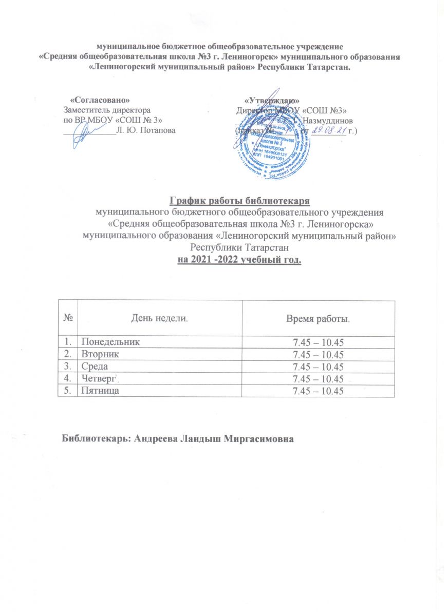 График работы школьной библиотеки МБОУ СОШ №3 на 2021-2022 учебный год