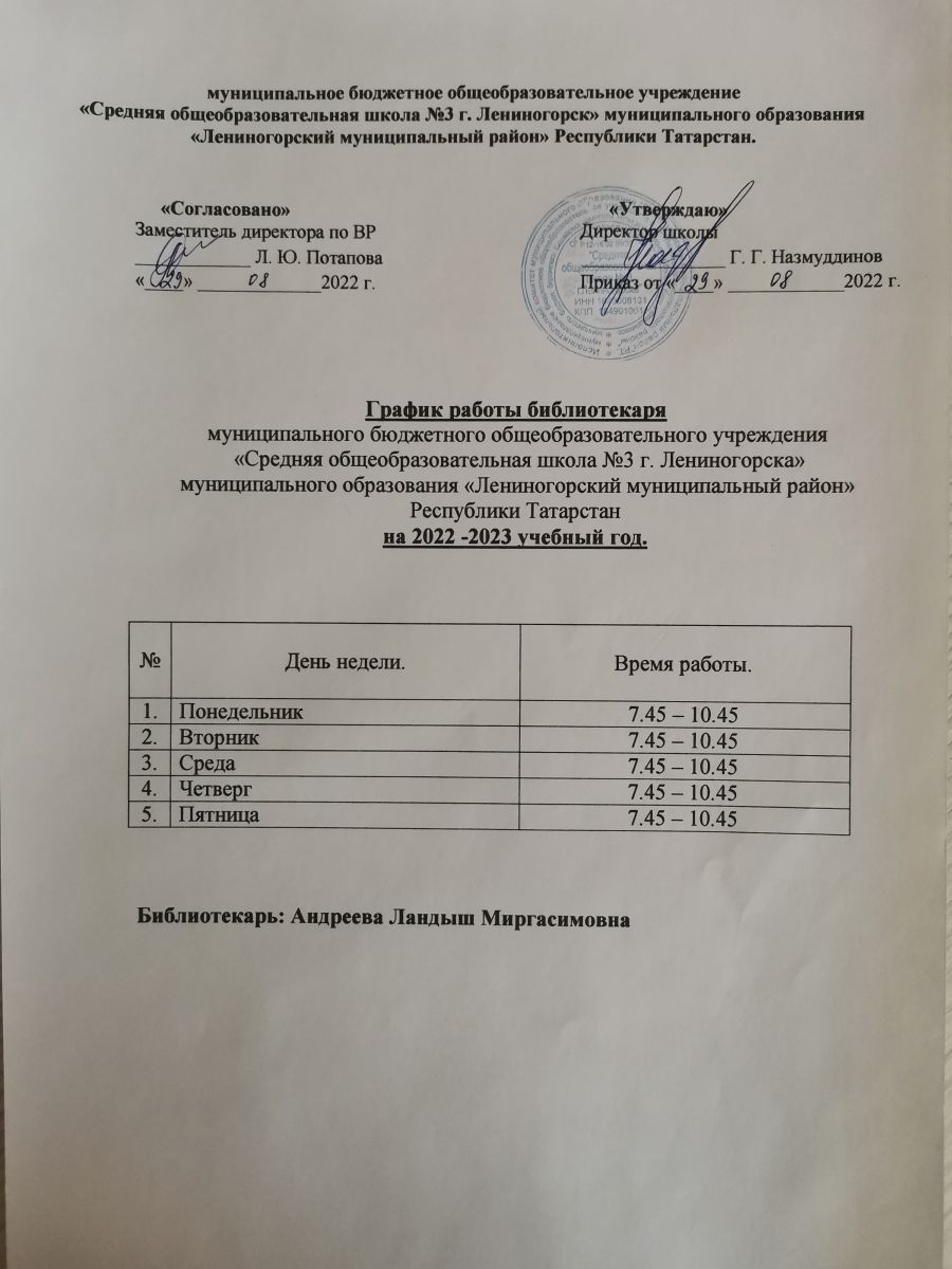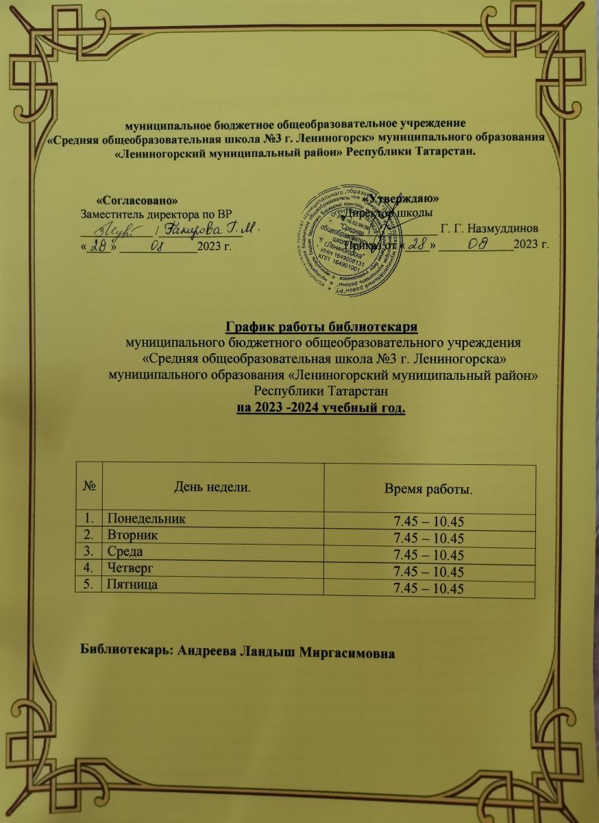 График работы школьной библиотеки МБОУ СОШ №3 на 2022-2023 учебный год