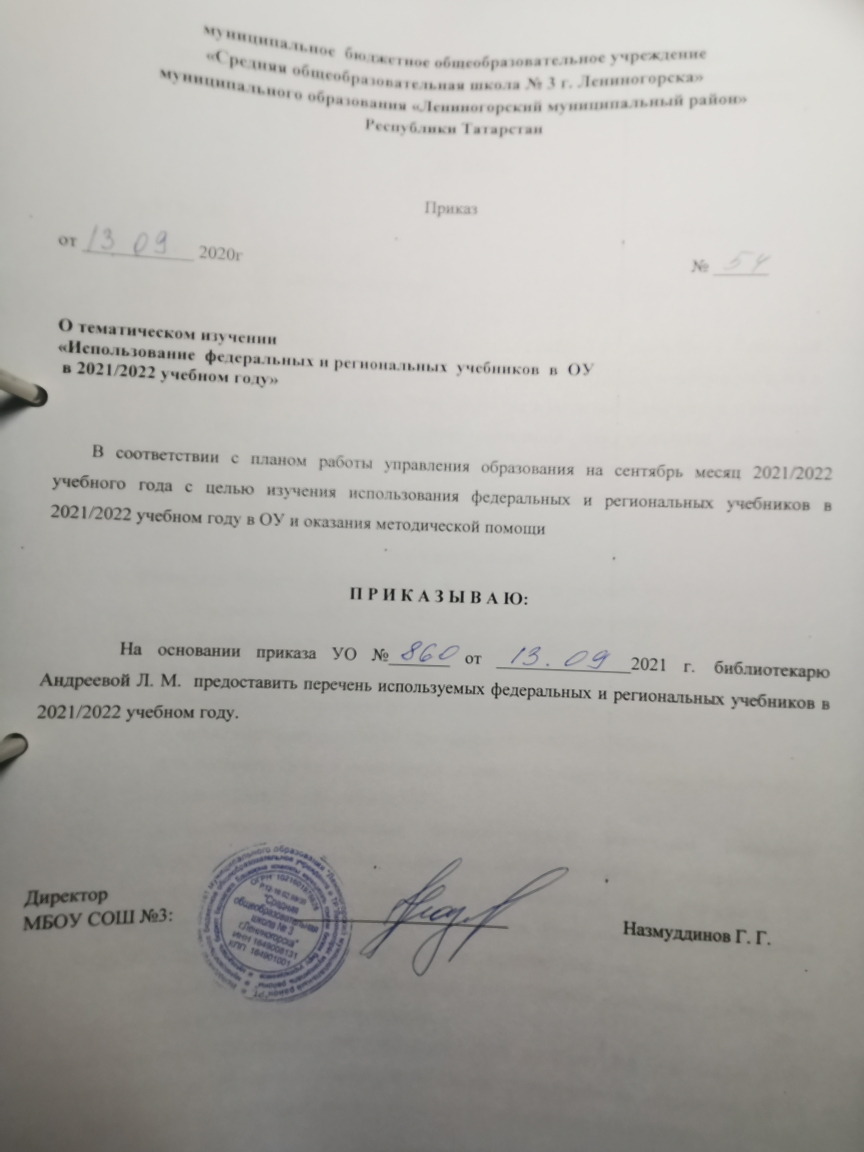 Приказ об утверждении перечня учебников в 2021-2022 учебном году