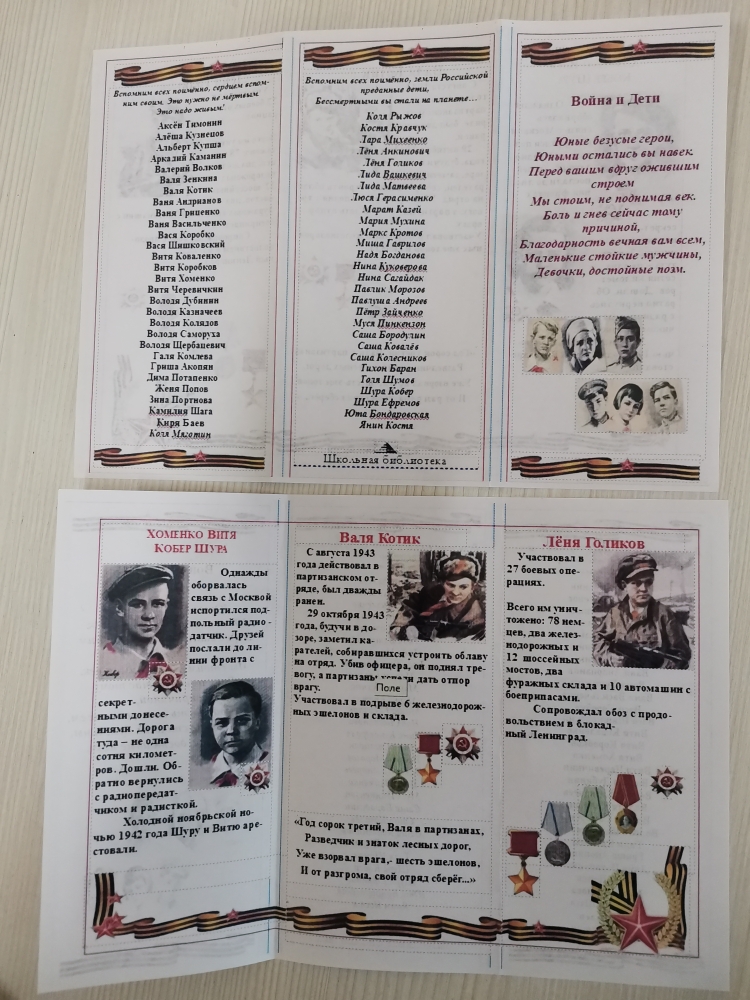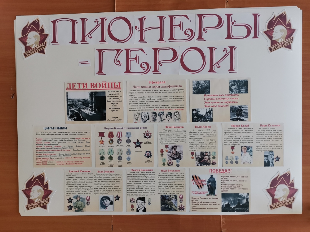 Пионеры-герои — советские пионеры, совершившие подвиги в годы становления Советской власти, Великой Отечественной войны.Образы пионеров-героев активно использовались в Советском Союзе как примеры высокой морали и нравственности. Официальный список «пионеров-героев» был оформлен в 1954 году с составлением Книги почёта Всесоюзной пионерской организации имени В.И. Ленина; к ней присоединились Книги почёта местных пионерских организаций.Четверо пионеров-героев были удостоены звания Героя Советского Союза: Лёня Голиков, Марат Казей, Валя Котик, Зина Портнова. Голикову, единственному из всех, звание было присвоено непосредственно во время войны (02.04.1944), остальным по окончании войны.Многие юные участники войны погибли в боях или были казнены немцами. Ряд детей был занесён в «Книгу почёта Всесоюзной пионерской организации им. В.И. Ленина» и возведён в ранг «пионеров-героев».В школьной библиотеке прошла выставка книг "Пионеры-герои" для учащихся 8 класса. Учащиеся ознакомились с выставкой предложенных книг, просмотрели листовки, записи времен ВОв. По окончанию экскурсии получили буклеты с информацией о пионерах-героях, изготовленными школьным библиотекарем Андреевой Л. М. -