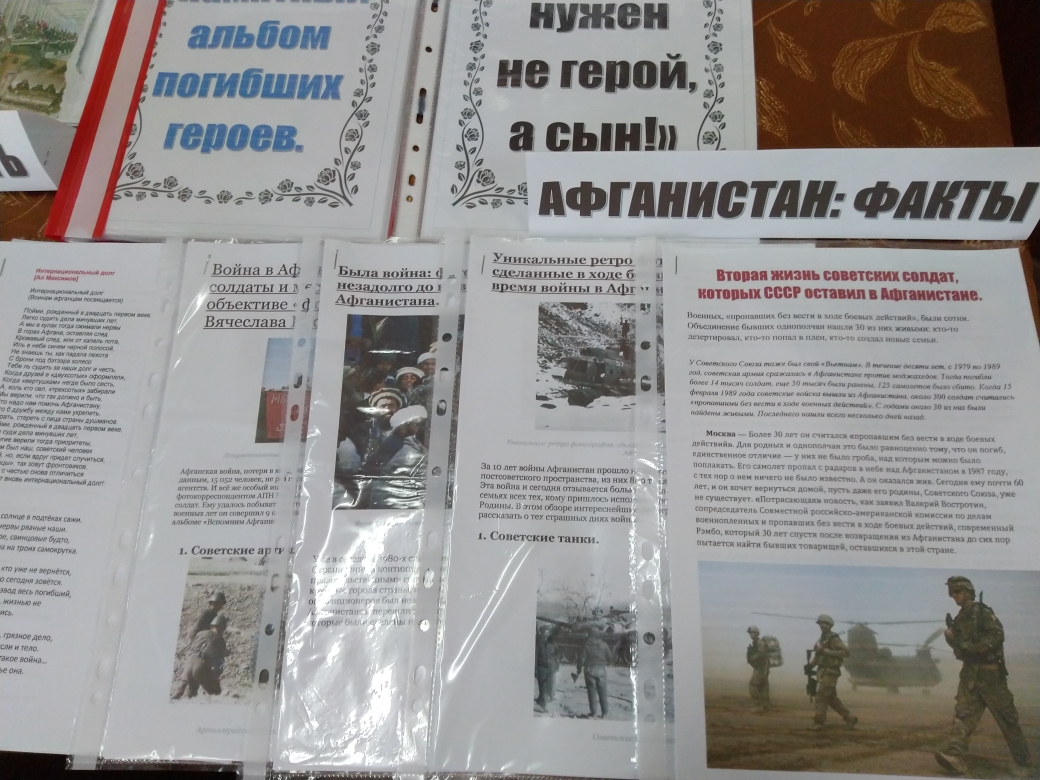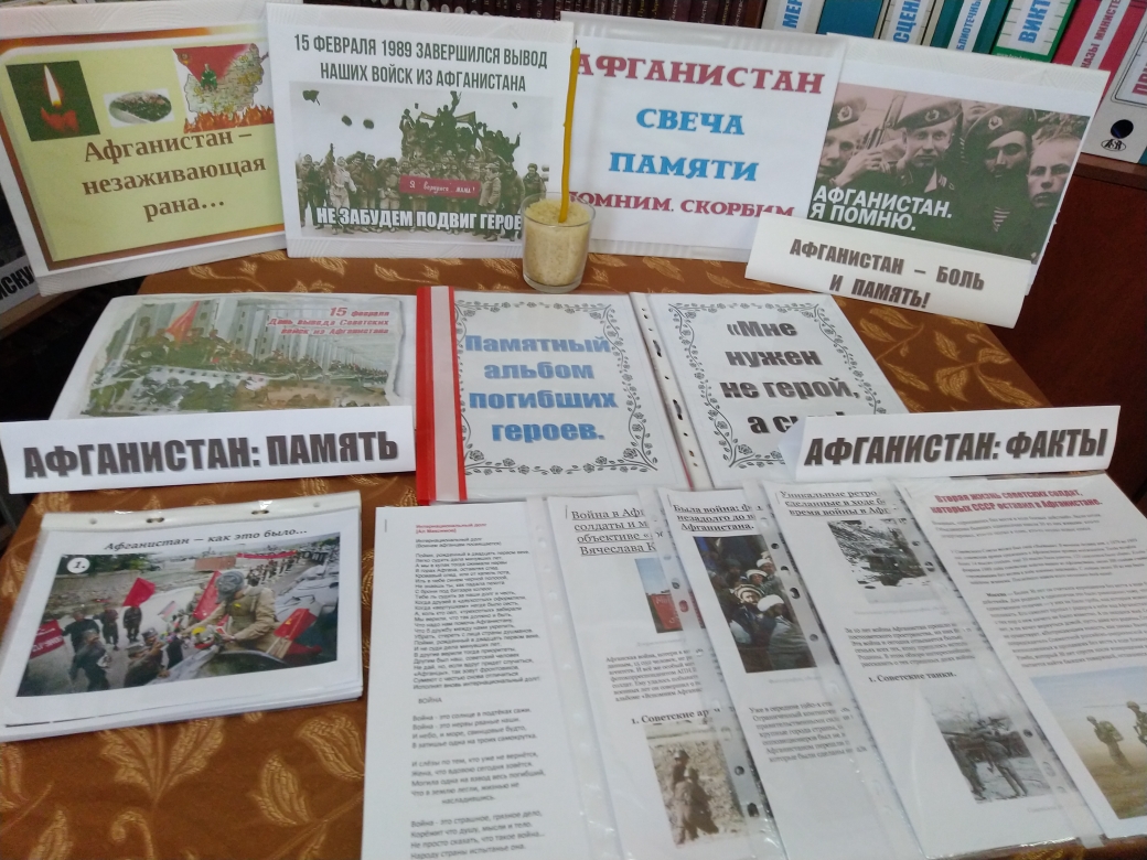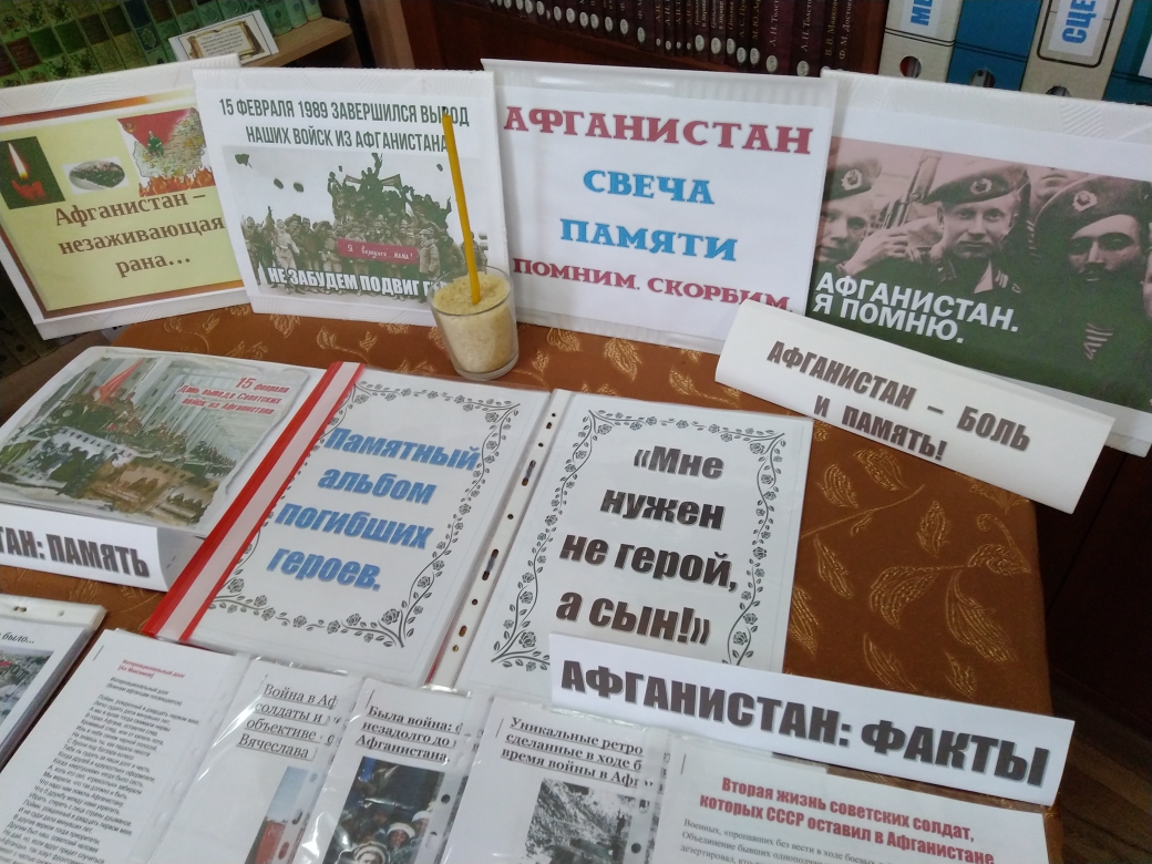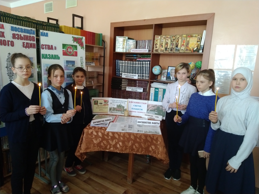 В школьной библиотеке оформлена выставка посвященная дню вывода советских войск с Афганистана. На выставке представлены статьи, фотоальбом, альбом памяти героев и многое другое. Учитель истории Мингазова Г. М. рассказала учащимся о трудностях прохождения службы, о героизме наших солдат.Самым долгожданным моментом для учащихся стало зажжение свечи памяти и минута молчания о погибших солдатах, отдавая дань уважения тем, кто проявил высочайшую силу духа, самоотверженность, героизм, выполняя боевой долг. К мероприятию была оформлена книжная выставка «Мы знаем и помним» и фотовыставка «Афганистан: боль и память». -