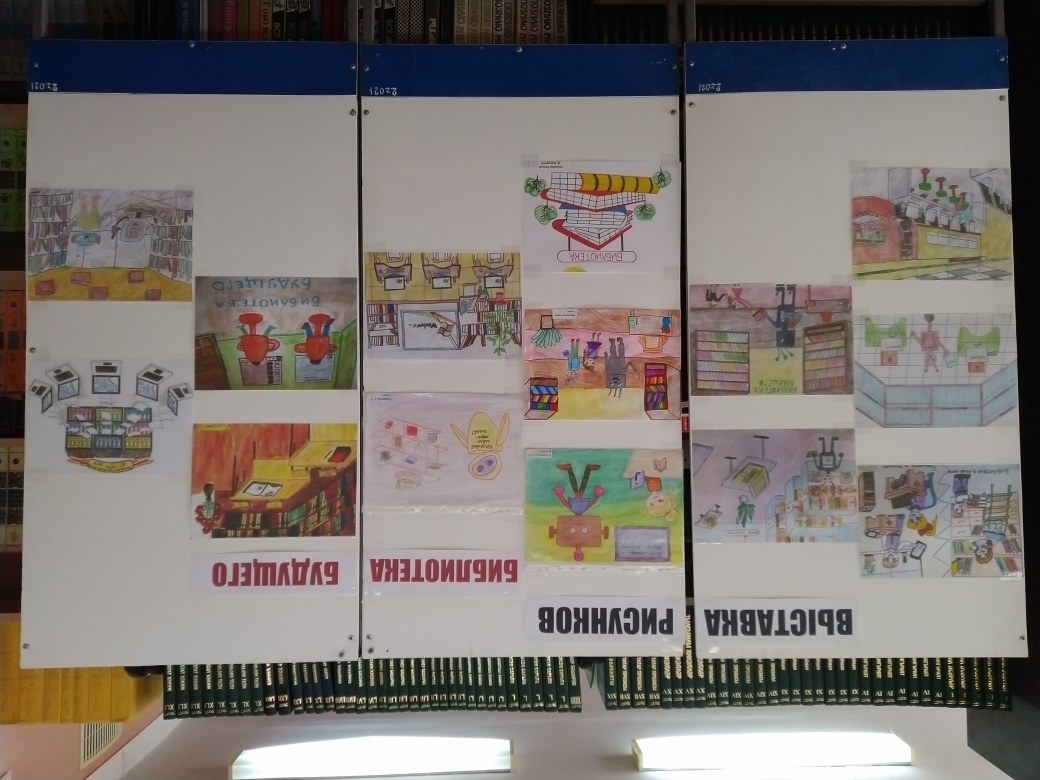 В школьной библиотеке оформлена выставка конкурсных рисунков "Библиотека будущего". В конкурсе приняли участие дети разных возрастных групп. Рисунки дети приносили в библиотеку на детский абонемент. Задача юных художников состояла в том, чтобы самим нарисовать героев или сюжеты. Каждый рисунок полностью соответствовал заявленной теме и условиям конкурса, а также отличался искренностью и оригинальностью. Участники конкурса самостоятельно решали, в какой художественной технике воплотить свою идею. -