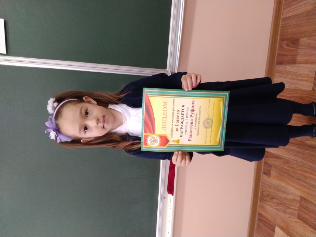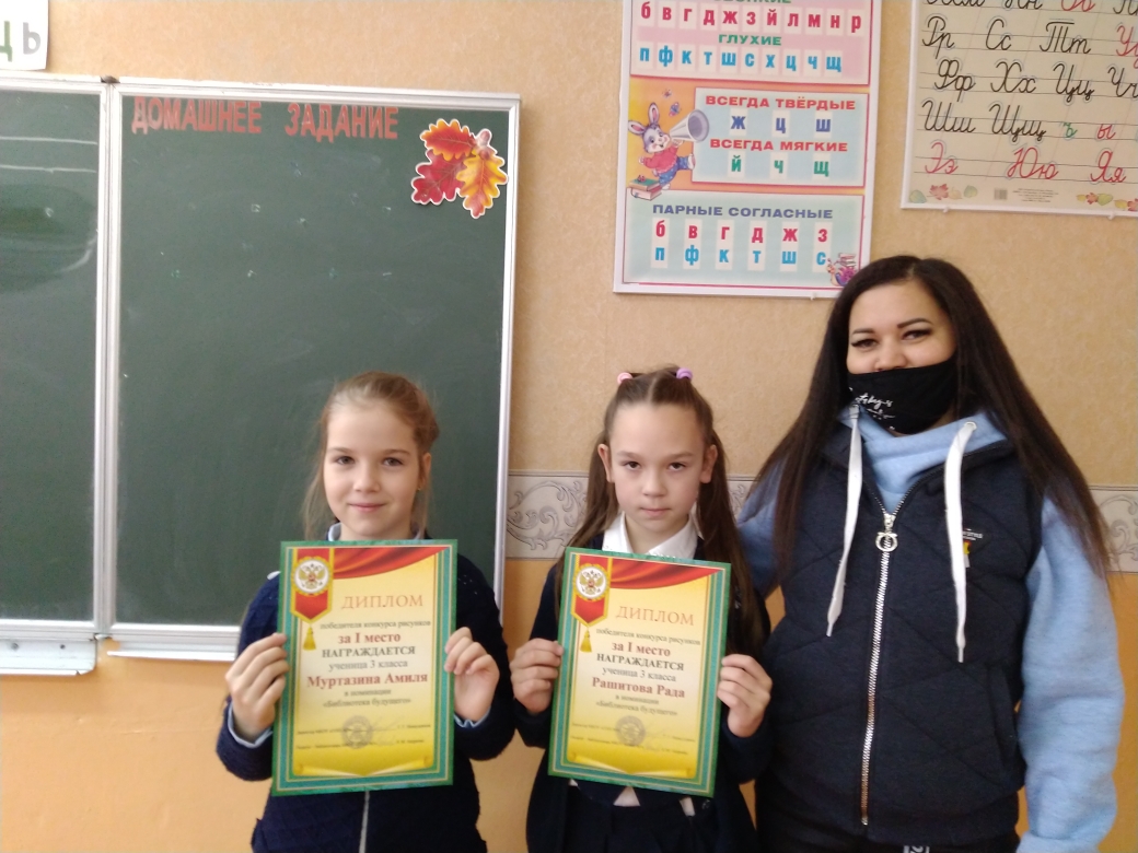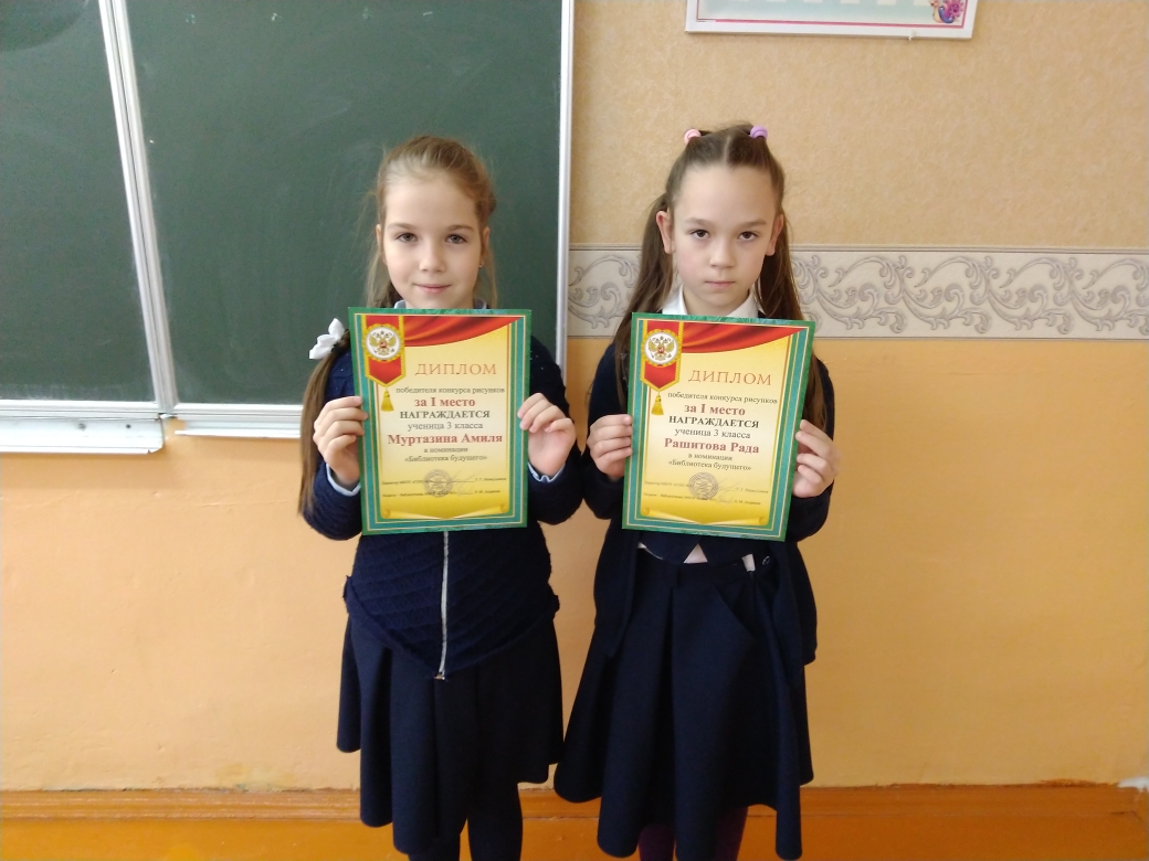 Сегодня в нашей школе прошло награждение победителей конкурса рисунков "Библиотека будущего".За I место награждается Рашитова Р. - 1 класс; Муртазина А. - 3 класс; Рашитова Р. - 3 класс (педагог - библиотекарь Андреева Л. М.) Поздравляем победителей конкурса!!! -