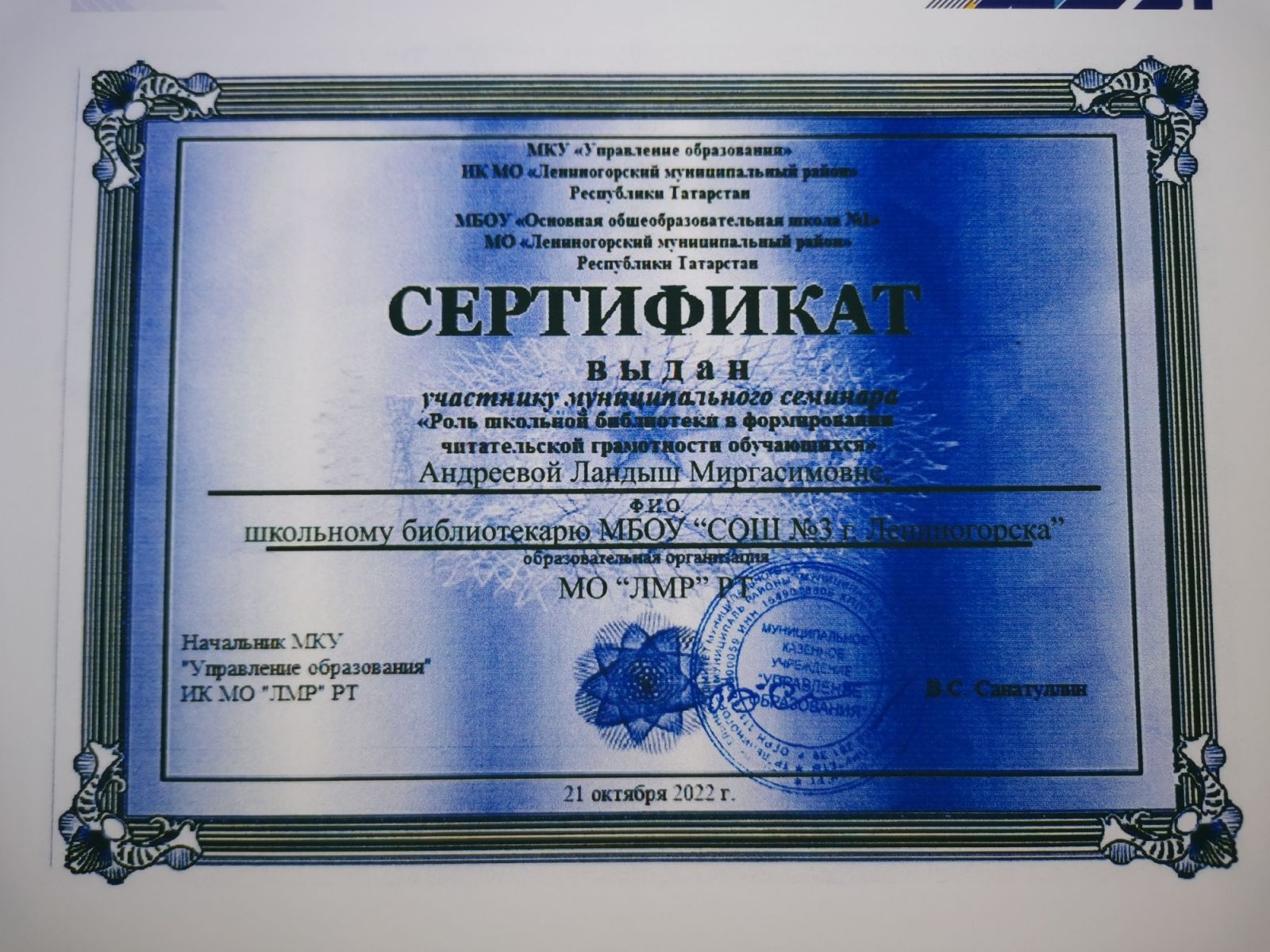 21 октября 2022 г. на базе МБОУ «ООШ №1» состоялся муниципальный семинар для школьных библиотекарей по теме: «Роль школьной библиотеки в формировании читательской грамотности обучающихся».На семинаре были выступления таких тем, как: «Активные формы и методы работы для развития читательского интереса обучающихся», «Культура чтения: от навыка – к творчеству», «Формирование читательской грамотности обучающихся начальной школы», «Приемы формирования читательской грамотности» (практикум), «Формирование читательской грамотности через проектную деятельность» (презентация школьного проекта), «Работа с несплошным текстом как способ формирования читательской грамотности» (мастер-класс), «Формирование читательской грамотности через педагогику удивления» (педагогическая мастерская) и «Использование электронных образовательных ресурсов в формировании функциональной грамотности».Школьный библиотекарь нашей школы Андреева Л. М. приняла участие в данном семинаре. Семинар прошел на одном дыхании в светлой и дружеской обстановке.
