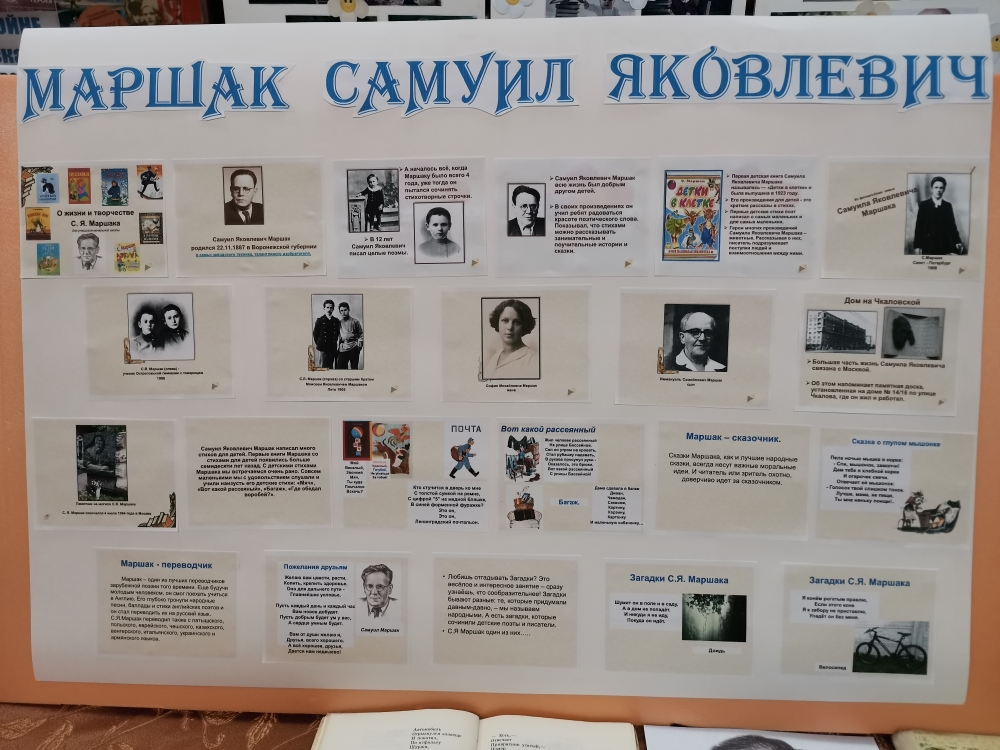 На стихах Самуила Яковлевича Маршака выросло не одно поколение детей. Кто не знает рассеянного с улицы Бассейной, даму с багажом, усатого - полосатого и многих, многих других?! Для юных читателей будет представлена книжная выставка, посвященная 135-летию со дня рождения поэта, где каждый ребенок сможет познакомиться с произведениями знаменитого писателя и окунуться в атмосферу замечательных сказок и стихотворений. Стихи С.Я. Маршака - это своего рода школа, где дети получают знания, знакомятся с окружающим миром, учатся дружить и трудиться. Его произведения актуальны и в наше время. О своих маленьких читателях поэт всегда говорил с большой любовью.В школьной библиотеке оформлена выставка печатных изданий С. Я. Маршака. -
