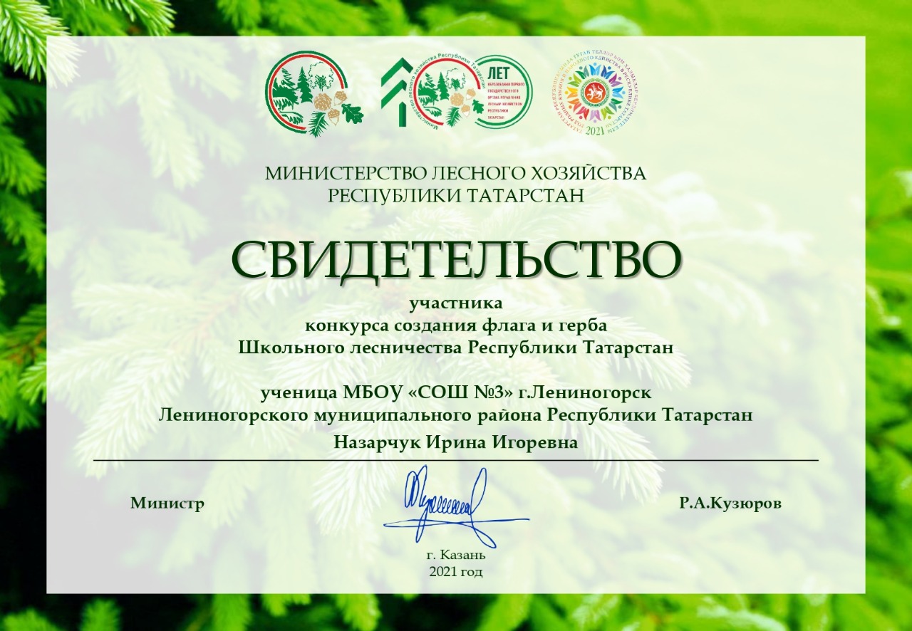 С 18 октября по 25 декабря 2021 года Министерством лесного хозяйства Республики Татарстан был проведен конкурс создания флага и герба Школьного лесничества Республики Татарстан. В этом конкурсе приняла участие воспитанница школьного лесничества «Дубки», ученица 7 класса Назарчук И. -