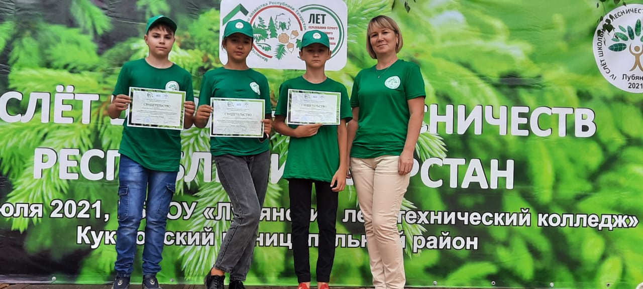 С 29 по 31 июля 2021 года на базе ГБПОУ «Лубянский лесотехнический колледж» в селе Лубяны Кукморского муниципального района прошёл IV Слет школьных лесничеств Республики Татарстан. Слет школьных лесничеств РТ проводится Министерством с целью привлечения детей и молодежи к исследовательской и природоохранной деятельности. Учащиеся 7 класса Батрашкин В., Ильмаиров Д., Назарчук И. активно приняли участие. -