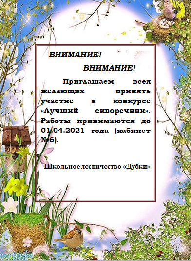 Приглашаем всех желающих принять участие в конкурсе "Лучший скворечник". Работы приносить 1 апреля в кабинет №6. Школьное лесничество "Дубки". -
