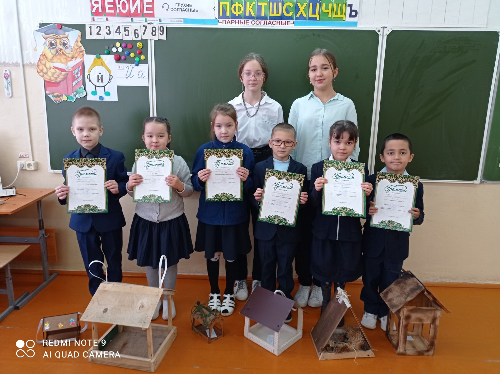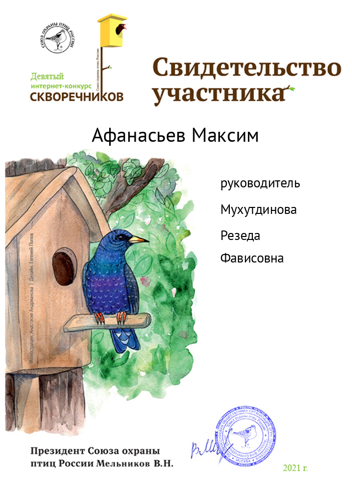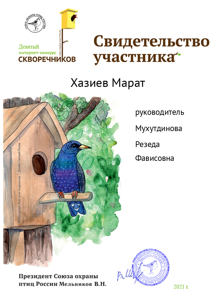 Общероссийская общественная организация «Cоюз охраны птиц России» организовала IX интернет - конкурс скворечников. Учащиеся 2 класса Хазиев М, Шайдуллин Т., Афанасьев М. приняли участие в этом конкурсе. -