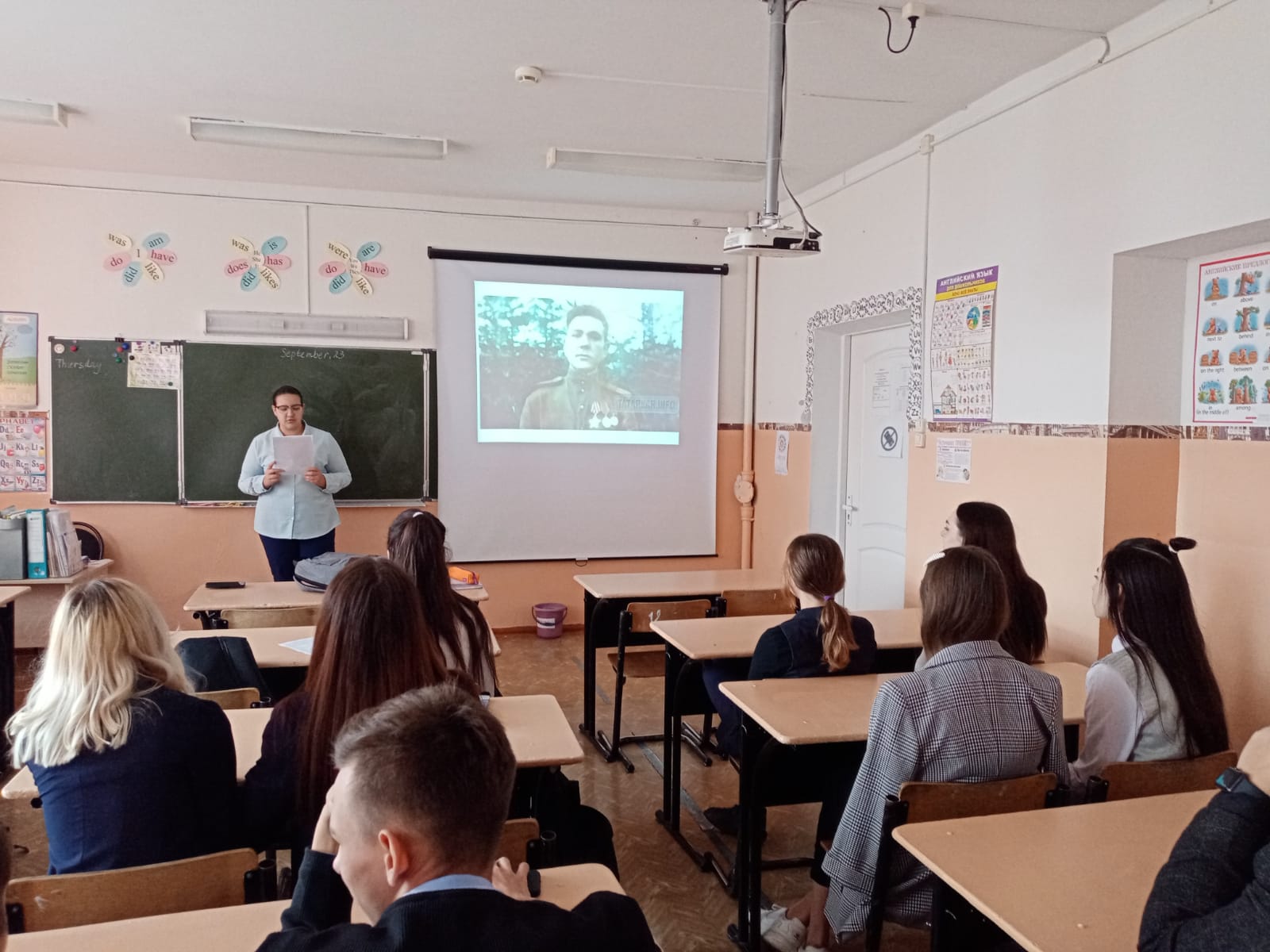 9 сыйныф укучылары (татар төркеме) Бөек Ватан сугышы каһарманы Гази (Газетдин) Казыйхан улы Заһитовның тууына 100 ел (1921–1953) тулу унаеннан аның турында сыйныфташларына сөйләделәр. Ул – 1945 елның 30 апрелендә рейхстаг гөмбәзенә беренче булып Җиңү байрагы элүче .Учащиеся 9 класса татарской группы ознакомили одноклассников с героем Великой Отечественной войны Гази (Газетдином) Казыхановичем Загитовым (1921–1953). Он 30 апреля 1945 года первым водрузил Знамя Победы на куполе рейхстага. -