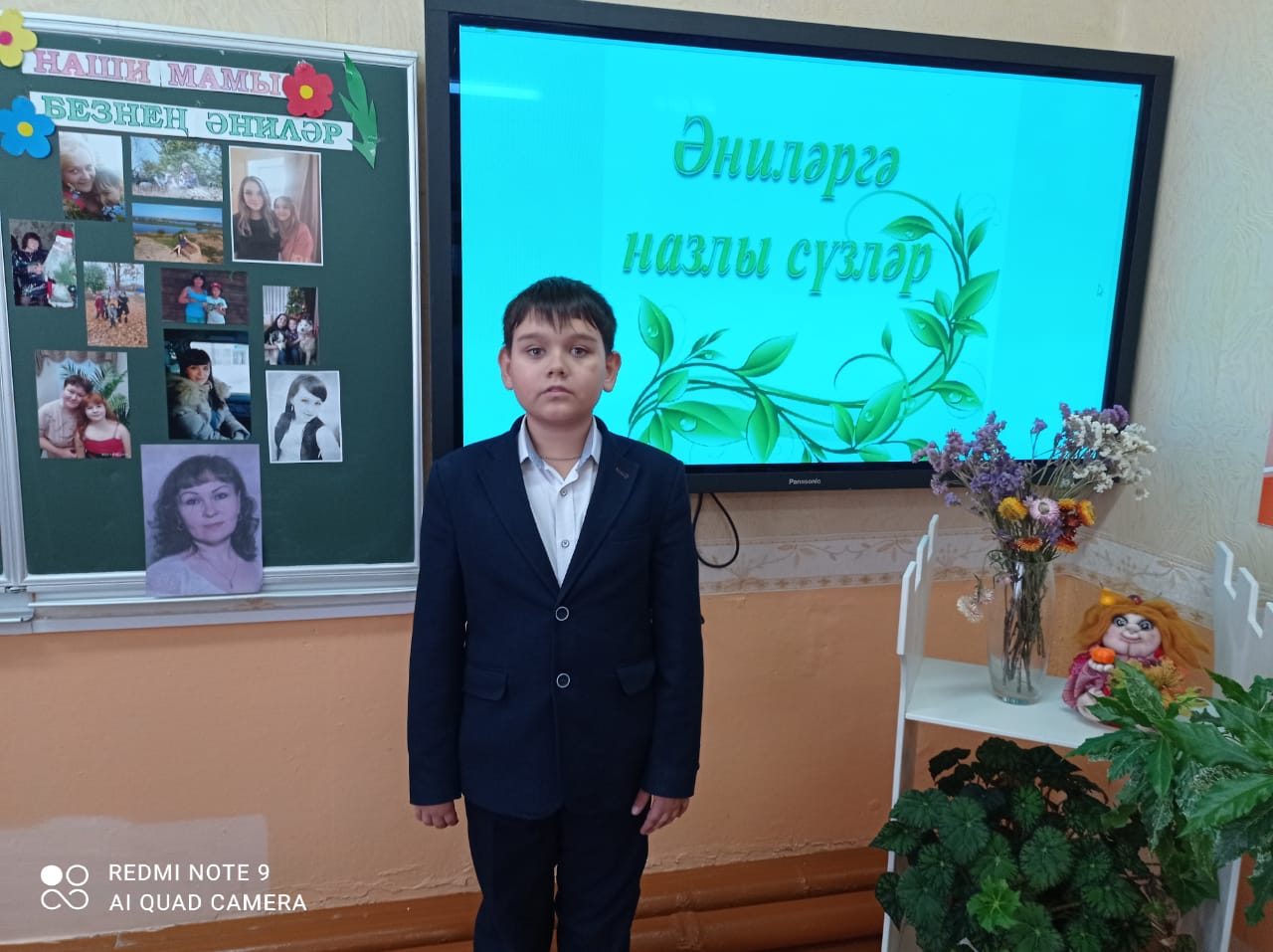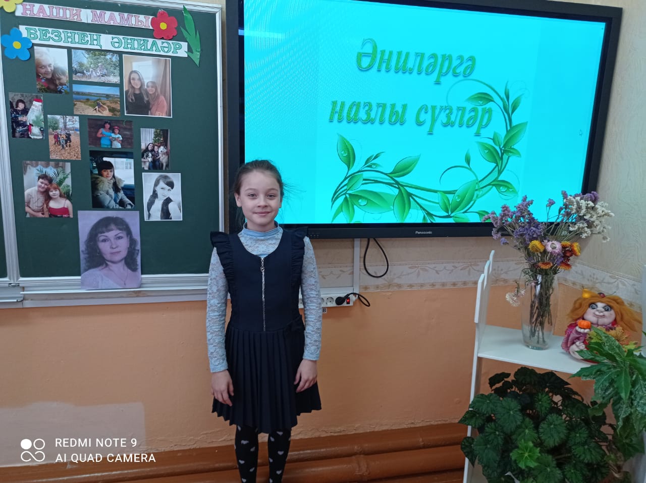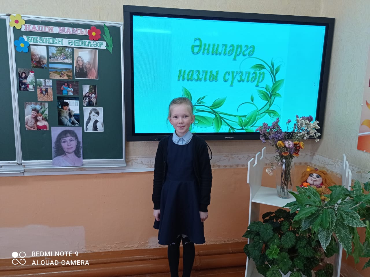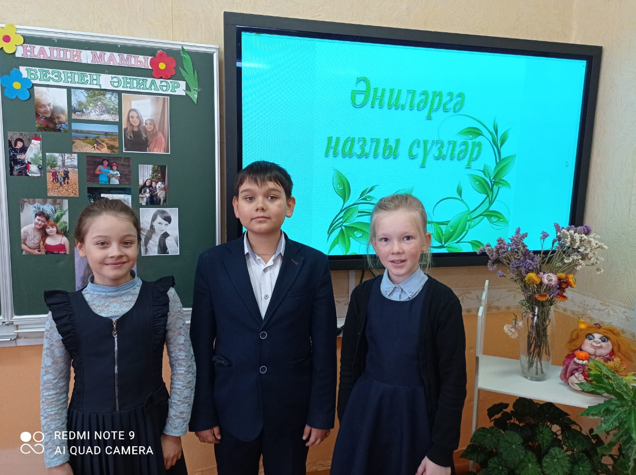 29ынчы ноябрь көнне татар теле һәм әдәбияты укытучысы Мөхетдинова Р.Ф. 3 енче сыйныф укучылары өчен «Әниләр сүзе» дип исемләнгән кичә уздырды. Кичәдә укучылар үзләренең әниләре турында сөйләделәр, җырлар башкардылар. Лепешкин Д., Бадртдинова С., Гилязова З., Хайруллина М. сыйныфташларына әниләр турында матур шигырьләр сөйләделәр.29 ноября учитель татарского языка и литературы Мухутдинова Р. Ф. провела для учащихся 3-х классов мероприятие «Слово матери». На празднике учащиеся рассказали о своих мамах, исполнили песни. Лепешкин Д., Бадртдинова С., Гилязова З., Хайруллина М. рассказали одноклассникам красивые стихи о маме. -