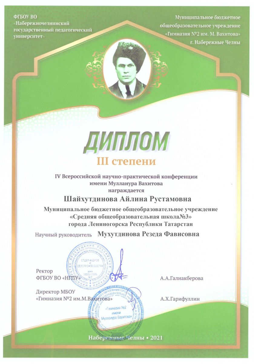 С целью обозначения проблем и путей их решения в сфере изучения языков, в том числе государственного языка Республики Татарстан, была проведена IV Всероссийская научно-практическая конференция им. М. Вахитова. Ученица 9 класса Шайхутдинова А. приняла участие в работе конференции и заняла 3 место.