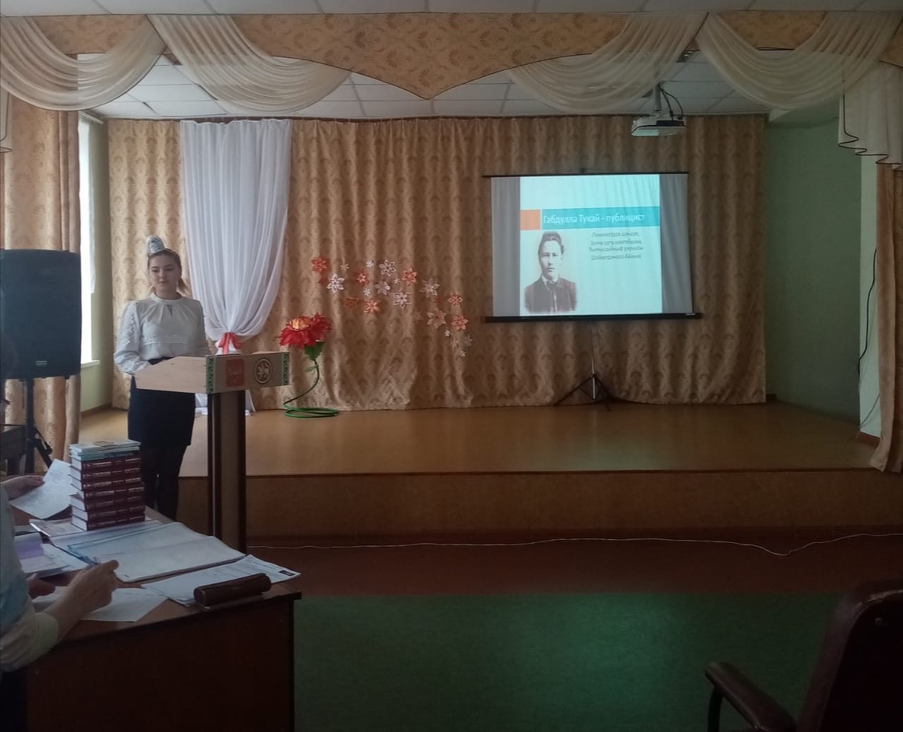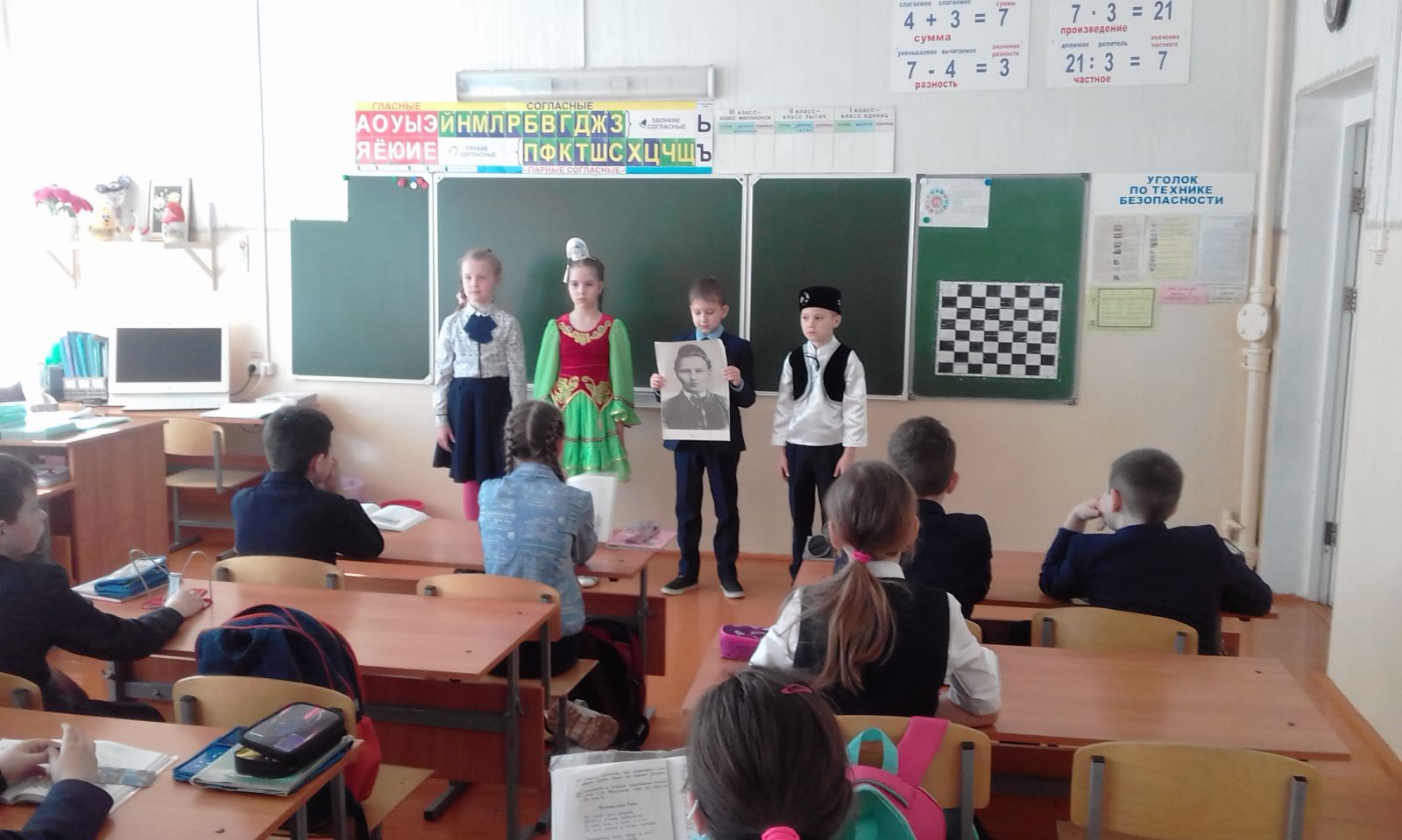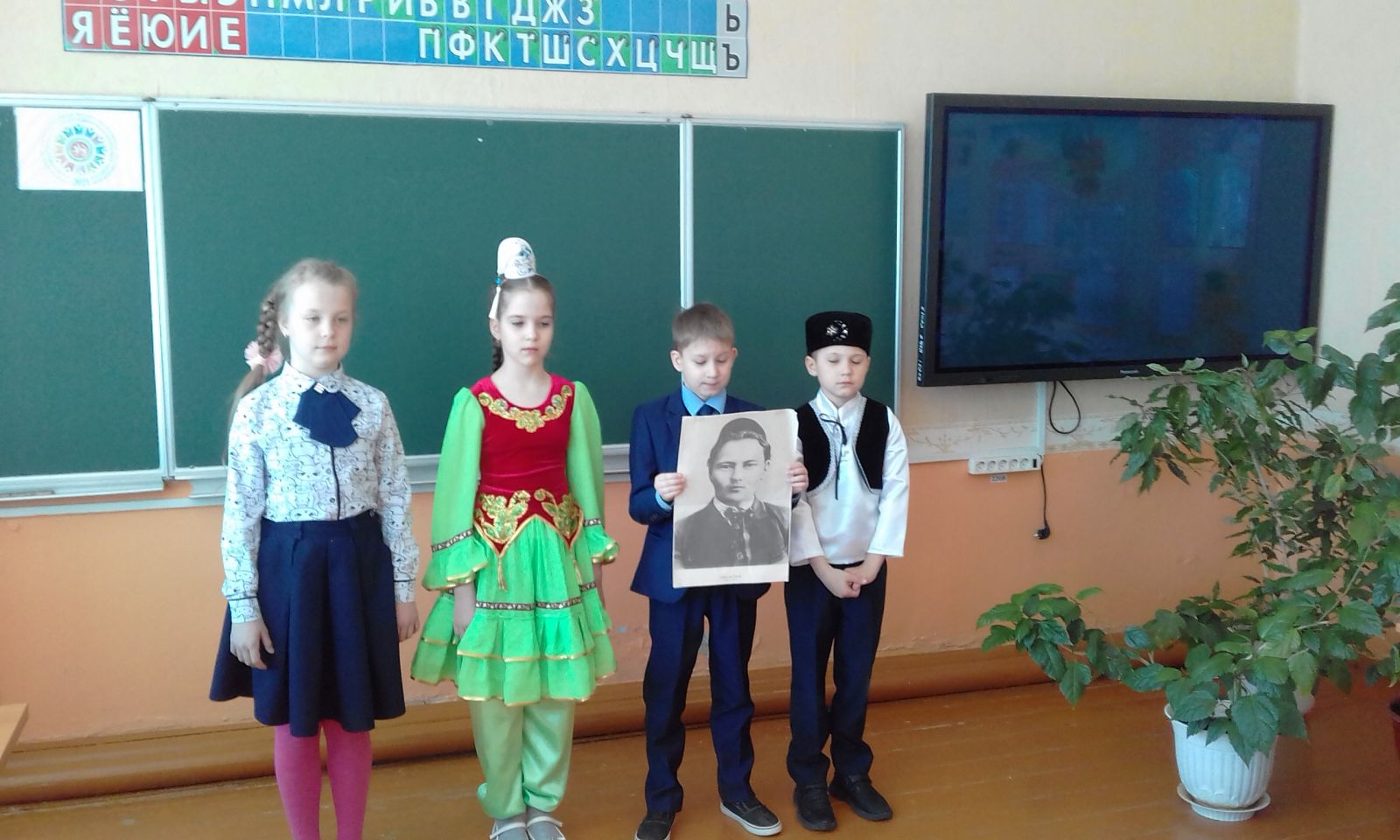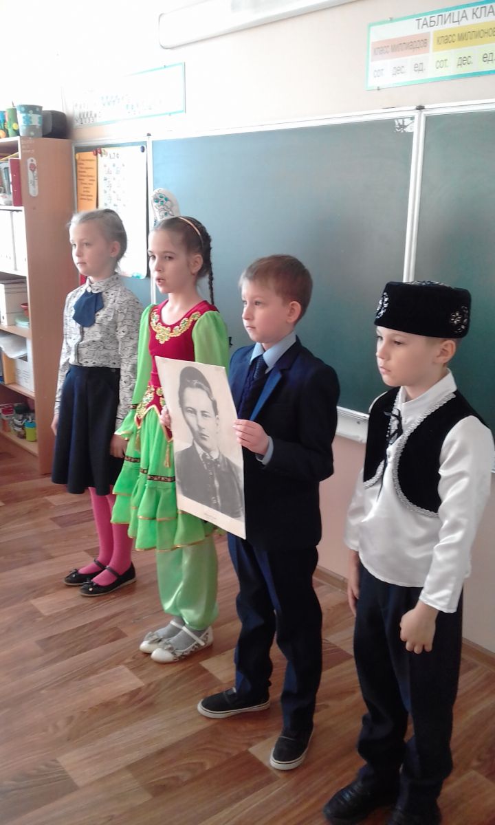 Татар теле һәм әдәбияты атналыгы сөекле шагыйребез Г.Тукайның тууына 135 ел тулу уңаеннан “Тукай безнең күңелләрдә” дип исемләнгән шигырь бәйрәме белән башланып китте. Укучылар шагыйрьнең шигырьләрен татар һәм рус телләрендә сөйләделәр.Неделя татарского языка и литературы началась с праздника поэзии “Тукай в наших сердцах”, посвященного 135-летию со дня рождения нашего любимого поэта Г. Тукая. Ученики читали стихи поэта на татарском и русском языках. -
