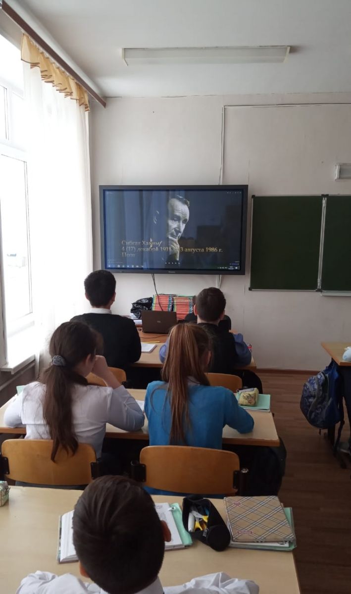 5 нче сыйныфта «Сибгат Хәким шигъриятендә туган як образы»дигән темага әдәбият дәресе узды. С.Хәкимнең шигырьләре зур тәрбияви әһәмияткә ия. Яшь чакта, әхлак нигезләре салына башлагач, рәссамның нәзакәтле сүзе белән туган табигатьнең гаҗәеп матурлыгын һәм шул ук вакытта аның нәзбереклеген, яралылыгын, кайчагында якланучанлыгын тою мөһим. Дәрестә аның шигырьләрен тыңлаганнан соң, балалар шагыйрьнең эчке дөньясы: игелеклелек, риясызлык, хезмәт сөючәнлек, намуслылык, мәхәббәт чагылыш табуын күреп алдылар. Ул күзәтүче кеше генә түгел, талантлы рәссам да, дөньяга карый, Кайчагында без сизми дә калуыбызга гаҗәпләнә белә. Шагыйрь туган табигатьне яхшы белә һәм аны аңлый. Ул кошларны «сөйләшү» гә тапшыра, алмагачларның чәчәкләре ничек таркала, сирень ничек чәчәк ата, яз ничек килеп җитә, кояш нурлана, чишмәнең ничек чәчәк атуы турында сөйли ала. Гүзәллекне күрү һәм аңлау-Әхлак нигезе. Кешегә салынган бу сыйфатларның нигезендә мәхәббәт ята.В 5 классе прошел урок литературы на тему «Образ родного края в поэзии Сибгата Хакима». Стихотворения С. Хакима имеют большое воспитательное значение. В юном возрасте, когда закладываются устои нравственности, важно почувствовать с помощью трепетного слова художника удивительную красоту родной природы и в то же время ее хрупкость, ранимость, иногда и беззащитность. Прослушав на уроке его стихотворения, ребята заметили, как в них отражается внутренний мир самого поэта: доброта, бескорыстие, трудолюбие, честность, любовь. Он не только наблюдательный человек, но и талантливый художник, умеет всматриваться в мир, удивляться тому простому, что порой мы не замечаем. Поэт хорошо знает родную природу и понимает ее. Он может передать «разговор» птиц, рассказать, как распускаются цветы яблони, как сирень цветет, как весна наступает, солнце светит, как родник журчит. Умение видеть и понимать прекрасное — есть основа нравственности. В основе этих качеств, заложенных в человеке, лежит любовь. -