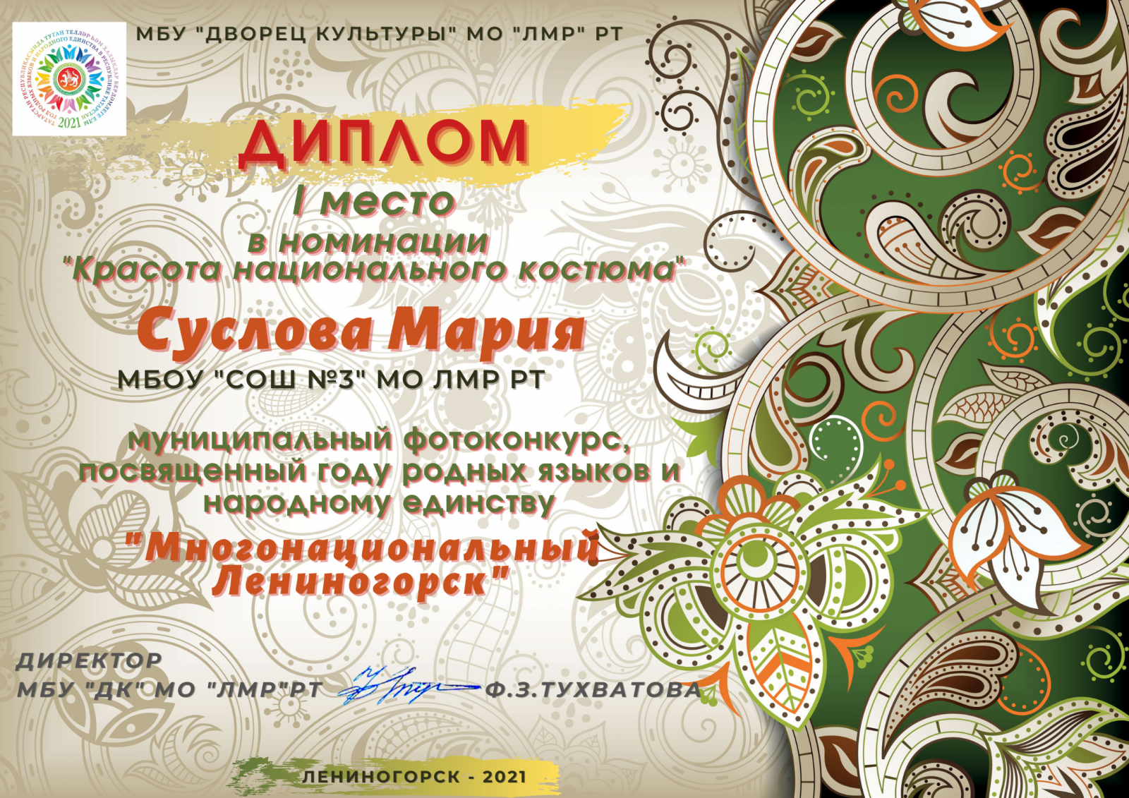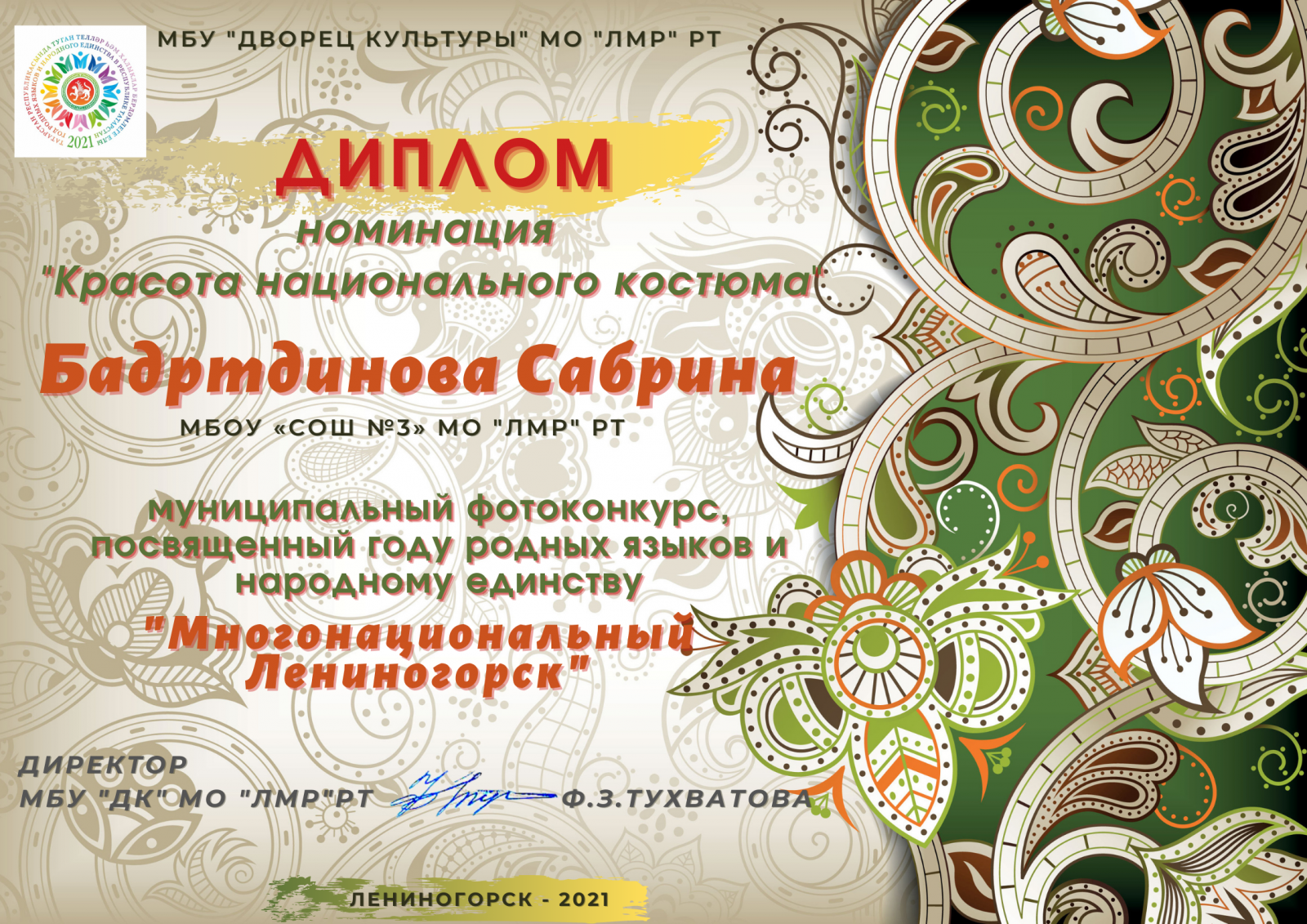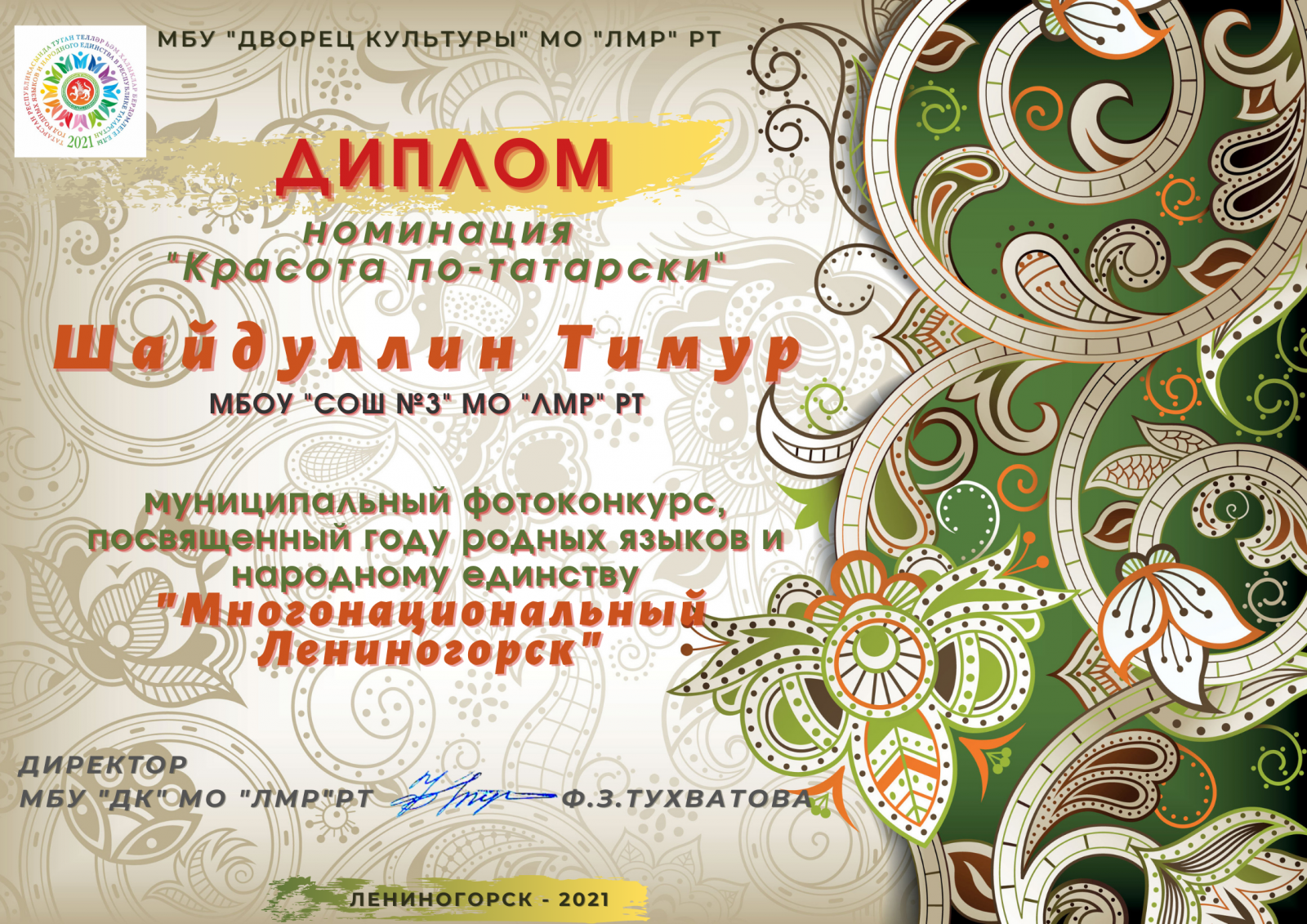 Татарстан халыкларының этномәдәни күптөрлелеген саклау һәм үстерү максатыннан Лениногорск шәһәре мәдәният йорты Татарстан Республикасында туган телләр һәм халык бердәмлеге елына багышланган "Күпмилләтле Лениногорск" фотоконкурсы оештыра. 2 нче сыйныф укучылары Бадртдинова С., Шәйдуллин Т., Суслова М. бу конкурста катнаша. Аларга уңышлар телибез!С целью сохранения и развития этнокультурного многообразия народов Татарстана МБУ "Дворец Культуры " МО "ЛМР" РТ организовал фотоконкурс «Многонациональный Лениногорск», посвященный году родных языков и народного единства в Республике Татарстан. Учащиеся 2 класса Бадртдинова С., Шайдуллин Т., Суслова М. принимают участие. Желаем им удачи!